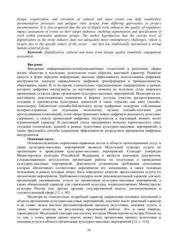 Ключевые фразы: цифровизация, проектирование культурно-массовых мероприятий, стандарты качества, оценка вовлеченности