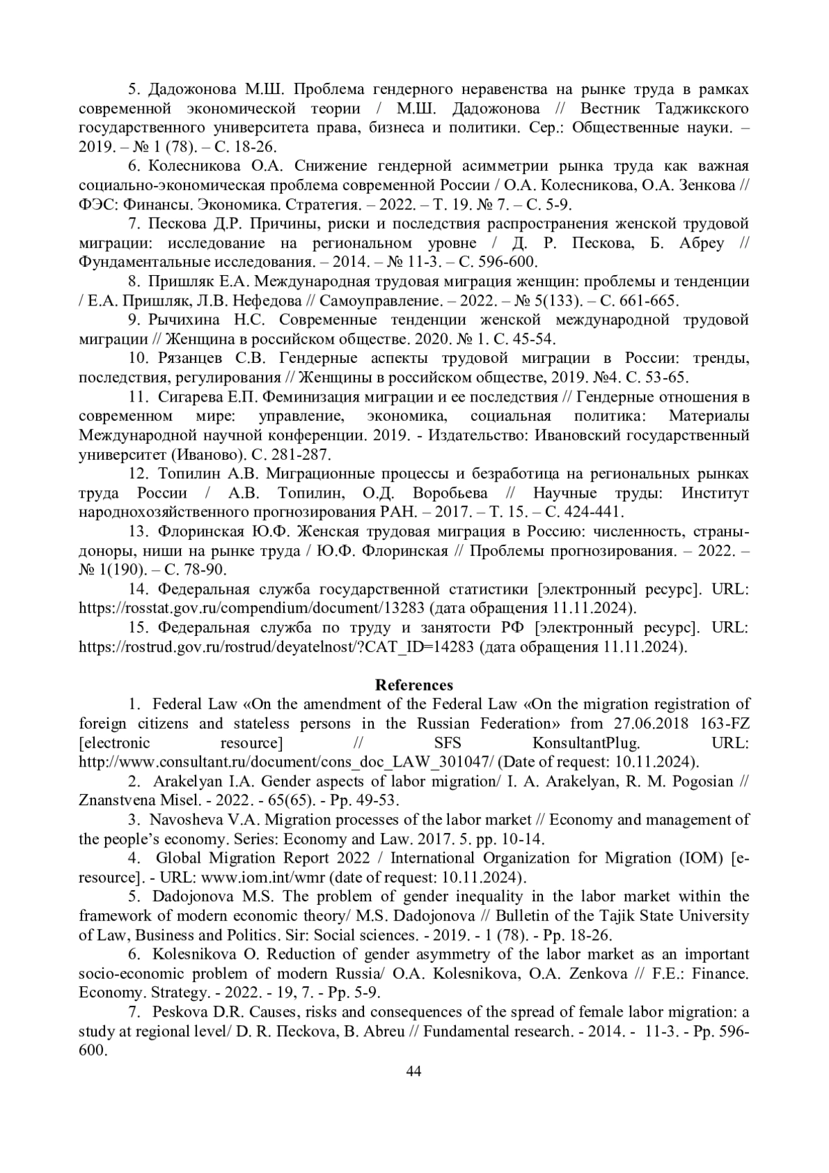 10. Рязанцев С.В. Гендерные аспекты трудовой миграции в России: тренды, последствия, регулирования // Женщины в российском обществе, 2019. №4. С. 53-65.