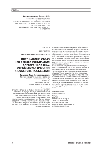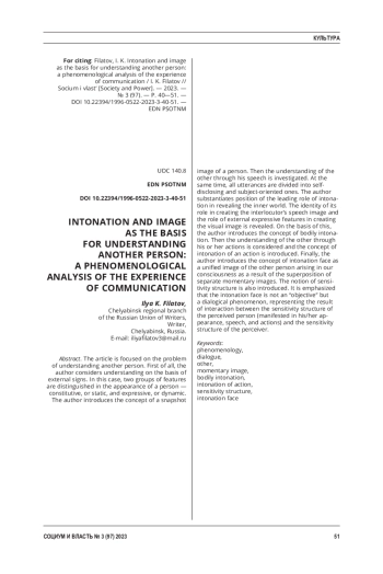 Статья посвящена проблеме понимания другого человека. В первую очередь рассматривается понимание на основе внешних признаков. При этом во внешности человека выделяется две группы признаков - конститутивные, или статические, и экспрессивные, или динамические. Вводится понятие моментального образа личности. Затем исследуется понимание другого через его речь. При этом все высказывания делятся на самораскрывающие и предметно-ориентированные. Обосновывается положение о ведущей роли интонации в раскрытии внутреннего мира. Обнаруживается идентичность её роли в создании речевого образа собеседника и роли внешних экспрессивных признаков в создании зрительного образа. На основании этого вводится понятие телесной интонации. Затем рассматривается понимание другого через его поступки и вводится понятие интонации поступка. В заключение вводится понятие интонационного лица как единого образа другой личности, возникающего в нашем сознании в результате суперпозиции отдельных моментальных образов. Также вводится понятие структуры чувствительности. Подчёркивается, что интонационное лицо является не «объективным», а диалогическим феноменом, представляя собой результат взаимодействия структуры чувствительности воспринимаемого человека (проявляющейся в его внешности, речи и поступках) со структурой чувствительности воспринимающего.