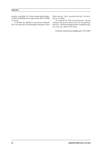 10. Шелер, М. Сущность и формы симпатии / М. Шелер // Horizon: Феноменологические исследования. - 2017. - № 6 (2). - С. 303-319. EDN: YOCZJE