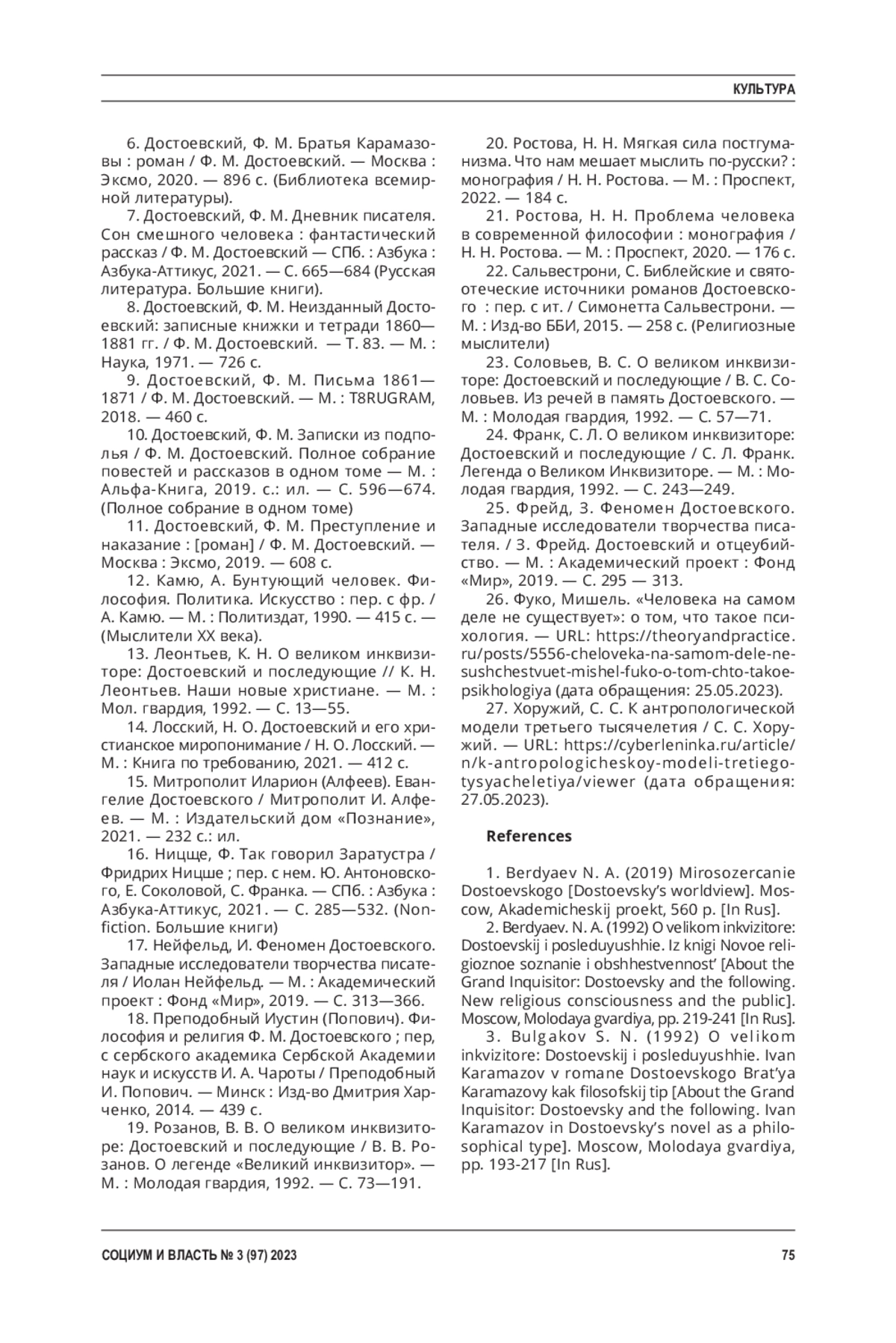 Цель. Целью данной статьи является попытка затронуть наиболее интересные, на взгляд автора, работы, существующие в мировом исследовательском поле, касающиеся философского понимания «Легенды о Великом инквизиторе», а также развить собственную мысль, в основе которой лежит попытка философско-антропологически преломить «Легенду…» и показать, что она несет в себе черты именно русской философской мысли и радикально отрицает деантропологические тенденции западной мысли, вытекающие из ее внутренней логики и закономерно приведшие ее к обнулению привилегированной позиции человека в мире, а также продемонстрировать возможности, которые предоставляет русская философская традиция для преодоления антропологической катастрофы, так широко обсуждаемой сегодня.