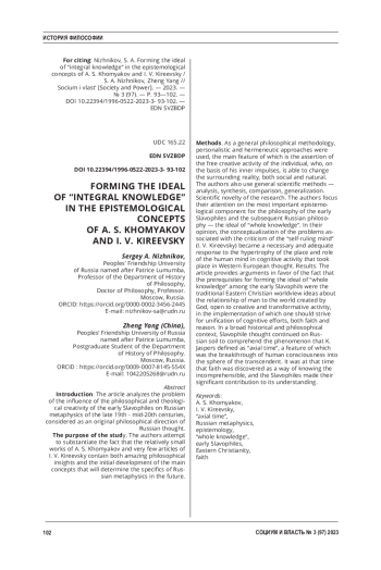 Введение. В статье анализируется проблема влияния философско-богословского творчества ранних славянофилов на русскую метафизику конца XIX - середины XX вв., рассматриваемую в качестве самобытного философского направления отечественной мысли. Цель. Авторами предпринимается попытка обоснования того, что в относительно небольших по общему объему трудах А. С. Хомякова и совсем немногих статьях И. В. Киреевского содержатся как удивительные философские прозрения, так и начальная разработка основных концептов, которые будут определять в будущем специфику русской метафизики. Методы. В качестве общефилософской методологии использовался персоналистский и герменевтический подходы, основная особенность которых состоит в утверждении свободно-творческой активности личности, способной, исходя из своих внутренних побуждений, изменять окружающую реальность, как социальную, так и природную. В исследовании применялись также общенаучные методы - анализ, синтез, сравнение, обобщение. Научная новизна исследования. Авторы акцентируют свое внимание на важнейшей для философии ранних славянофилов и последующей русской философии гносеологической компоненте - на идеале «цельного знания». По их мнению, концептуализация проблематики, связанной с критикой «самовластвующего рассудка» (И. В. Киреевский), стала необходимой и адекватной реакцией на происходившее в западноевропейской мысли гипертрофирование места и роли человеческого разума в познавательной деятельности. Результаты. В статье приводится аргументация в пользу того, что предпосылками для формирования идеала «цельного знания» у ранних славянофилов явились свойственные традиционному восточно-христианскому мировоззрению представления об отношении человека к сотворенному Богом миру, открытому для творчески-преобразовательной деятельности, при осуществлении которой следует стремиться к объединению познавательных усилий, как веры, так и разума. В широком историко-философском контексте славянофильская мысль продолжила на русской почве осмысление того феномена, который К. Ясперс определил как «осевое время», особенностью которого стал прорыв человеческого сознания в сферу трансцендентного. Именно в то время была открыта вера как способ познания непостижимого, а славянофилы внесли свой весомый вклад в ее осмысление.
