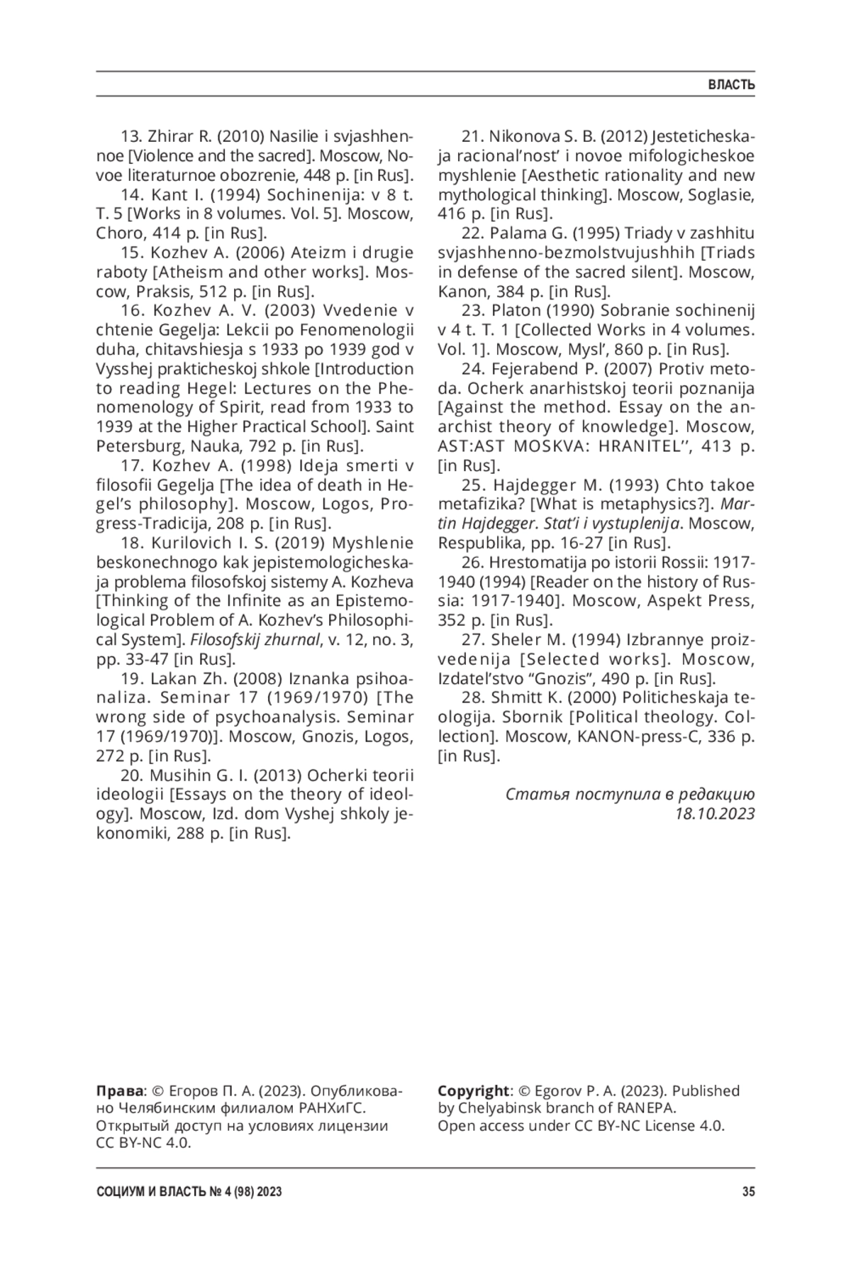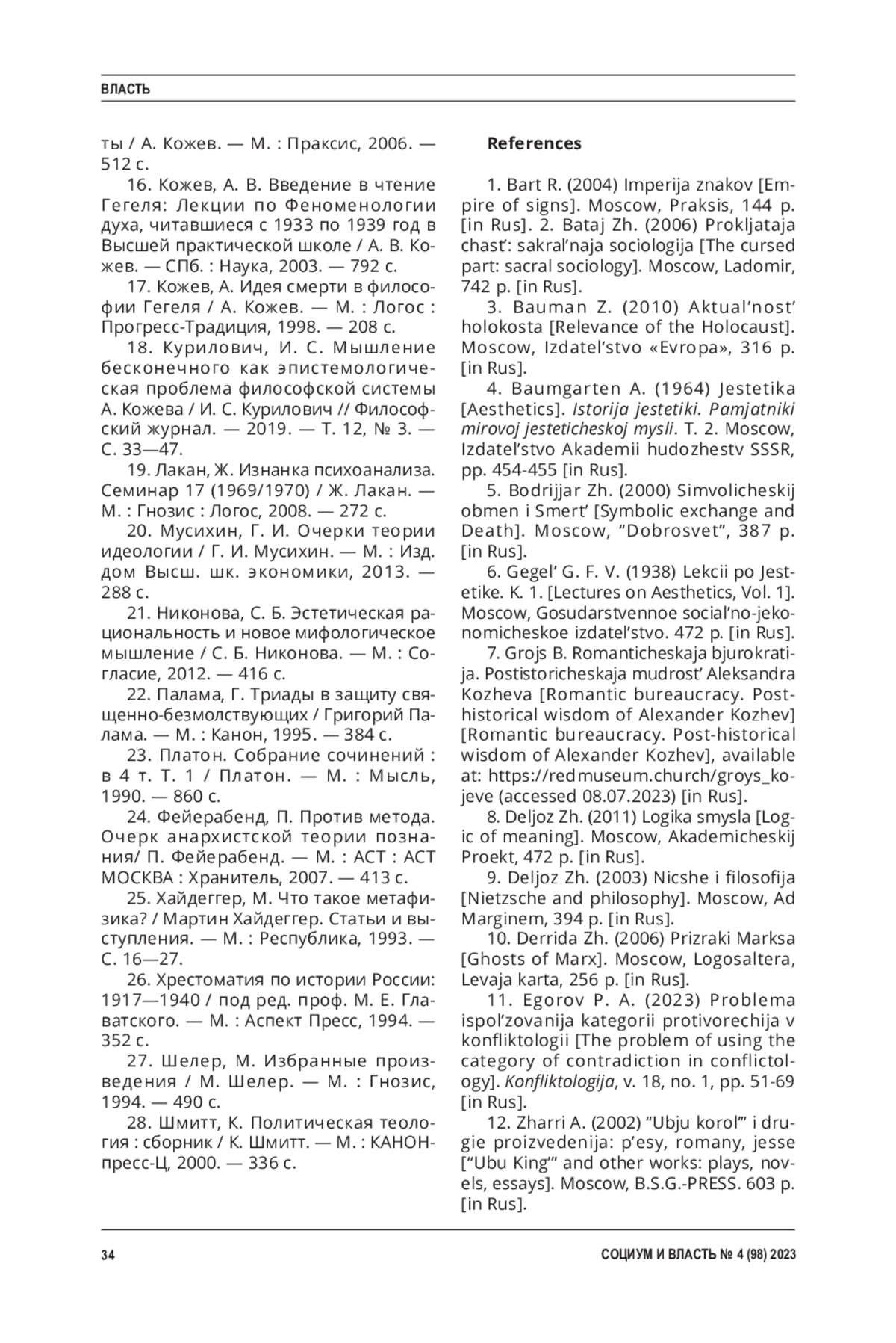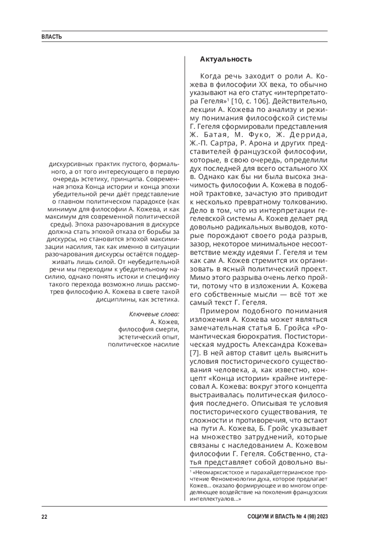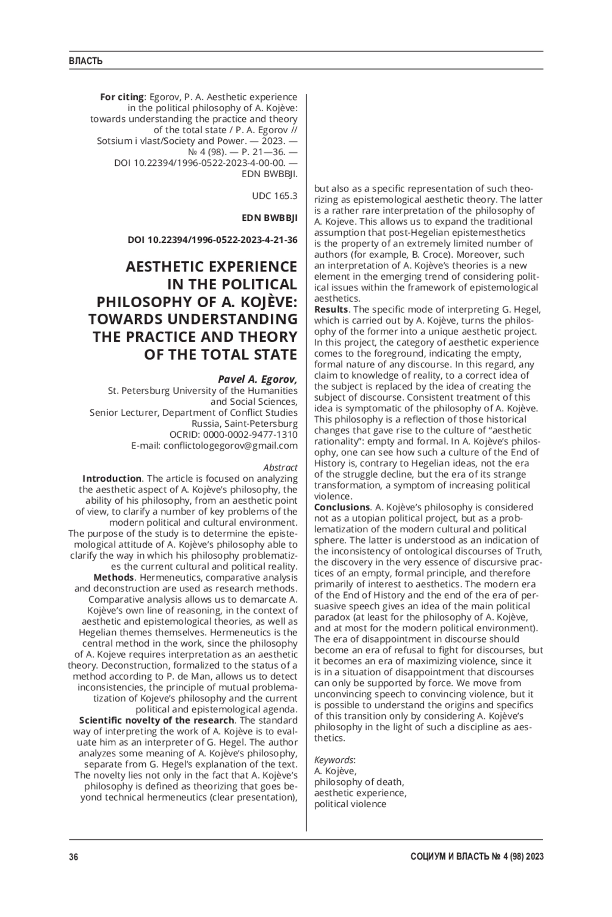 Результаты. Специфический режим интерпретации Г. Гегеля, который осуществляет А. Кожев, превращает философию первого в своеобразный эстетический проект. В этом проекте на передний план выходит категория эстетического опыта, указывающая на пустой, формальный характер любого дискурса. В этой связи всякая претензия на знание действительности, на верное представление о предмете заменяется идеей творческого создания предмета дискурса. Последовательное рассмотрение этой идеи и является симптоматикой философии А. Кожева. Такая философия является отражением тех исторических изменений, которые породили культуру «эстетической рациональности »: пустую и формальную. В философии А. Кожева можно увидеть, как подобная культура Конца истории является, вопреки гегельянским представлениям, не эпохой заката борьбы, а эпохой её странной трансформации, симптомом возрастания политического насилия.