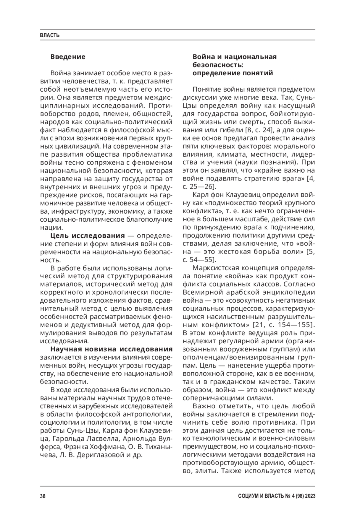 Введение. Война занимает особое место в развитии человечества, т. к. представляет собой неотъемлемую часть его истории. Проблема войны является предметом междисциплинарных исследований на протяжении всего периода становления социальных наук. Осмысление противоборства народов и отдельных социальных групп имеет место в философской мысли со времен возникновения первых крупных цивилизаций. На современном этапе развития общества проблематика войны тесно сопряжена с феноменом национальной безопасности, которая направлена на защиту государства от внутренних и внешних угроз и предупреждение рисков, посягающих на гармоничное развитие человека и общества, инфраструктуру, экономику, а также социально-политическое благополучие нации.