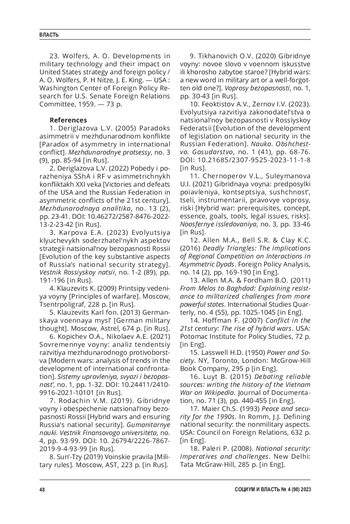 Выводы. На современном этапе развития мирового сообщества классификация войн существенно изменилась и расширилась. Это обстоятельство, в свою очередь, требует от государства изменения принципов обеспечения национальной безопасности, основанной на превентивных способах организации и практической реализации, устойчивой национальной идентичности, эффективной работе всех акторов национальной безопасности, стремлении к социально-экономической и политической стабильности.