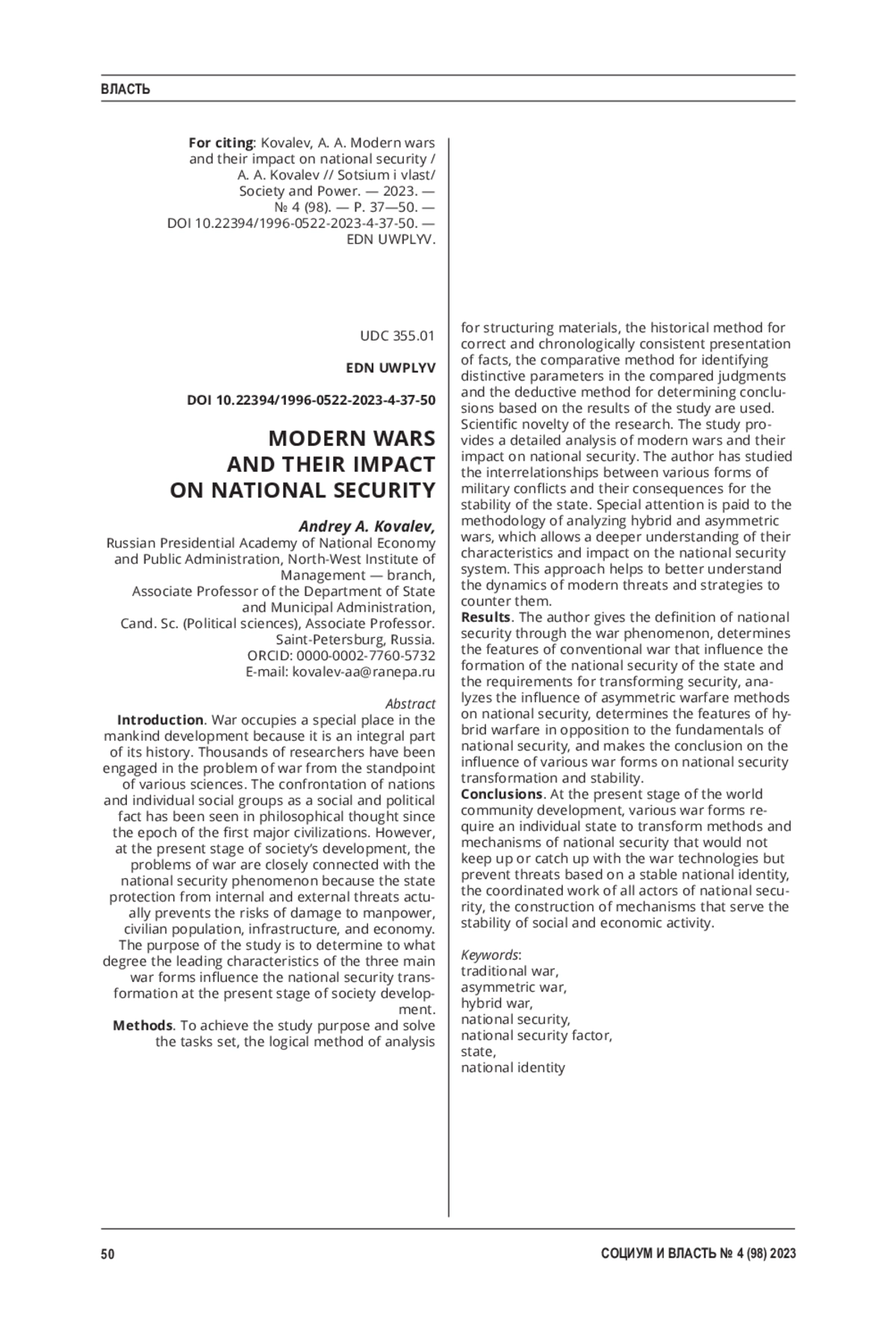Методы. В работе использованы: логический метод для структурирования материалов, исторический метод для корректного и хронологически последовательного изложения фактов, сравнительный метод с целью выявления особенностей рассматриваемых феноменов и дедуктивный метод для формулирования выводов по результатам исследования. Научная новизна исследования. В исследовании проведен детальный анализ современных войн и их воздействия на национальную безопасность. Автором изучены взаимосвязи между различными формами военных конфликтов и их последствиями для стабильности государства. Особое внимание уделено методологии анализа гибридных и асимметричных войн, что позволило глубже понимать их характеристики и влияние на систему национальной безопасности. Этот подход помогает лучше осознавать динамику современных угроз и стратегии их противодействия.