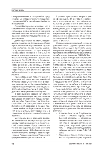 Конференция была организована в смешанном формате, что позволило принять в ней участие как в очном, так и в онлайн-формате представителям органов государственной власти и местного самоуправления, научного сообщества и некоммерческих организаций из Москвы, Санкт-Петербурга, Новосибирска, Нижнего Новгорода, Екатеринбурга, Кургана, Смоленска, Алтайского края, а также муниципальных образований Челябинской области.
