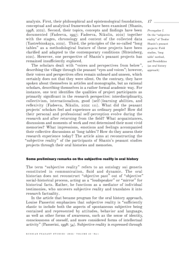 The article reconstructs the researchers’ “subjective reality” in Teodor Shanin’s peasant studies projects. While there has been extensive research on methodological, epistemological and empirical dimensions of these projects, little attention has been paid to personal experiences, emotions and transformations of the researchers. This study aims at filling this gap by reconstructing their subjective perceptions through oral histories, memories and published sources and also at ‘localizing’ such a subjective reality by examining its connection with the Peredelkino House of Creativity, where Shanin’s research team used to meet periodically. The article consists of the following parts: first, it outlines the broader conditions of Shanin’s peasant studies expeditions; then it focuses on “subjective reality of the first encounters” with Shanin and his ideas; the fieldwork is examined through the researchers’ observation of rural communities, their efforts to gain peasants’ trust and methodological challenges they faced; further, the study considers the long table discussions at Peredelkino, emphasizing their dual function as spaces for methodological and personal support; finally, the author explains institutionalization of the projects’ subjective reality through their lasting impact on research and educational initiatives of its participants. The findings show that the scholars’ subjective reality was deeply intertwined with the broader intellectual and social-political transformations of the 1990s, which resulted in the specific research culture of Shanin’s peasant studies projects - a combination of reflections on ethnographic experiences, analytical and methodological frameworks with personal experiences, friendship, and intellectual partnership.