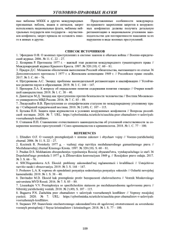 1. Эфендиев О.Ф. О военных преступлениях в системе законов и обычаев войны // Военно-юридический журнал. 2006. № 11. С. 22 - 27. EDN: KXDFNF