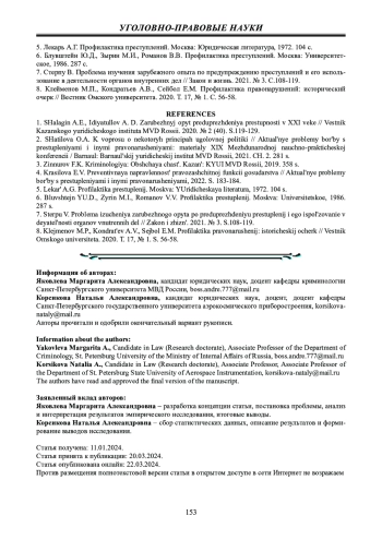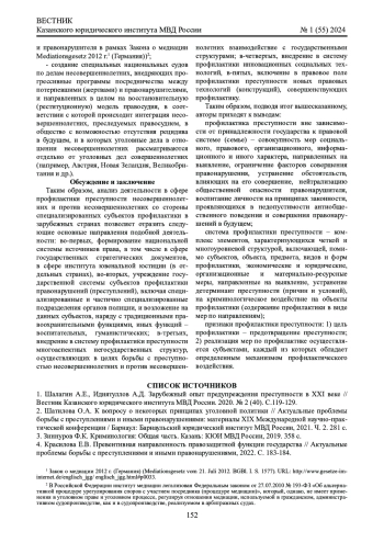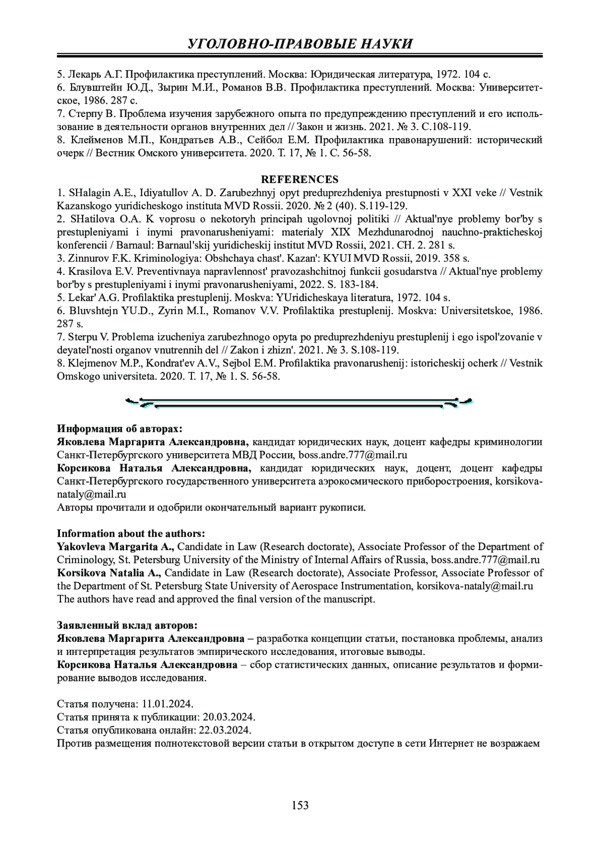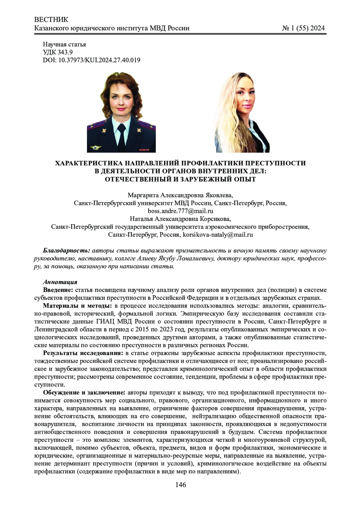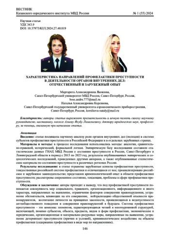 ЯКОВЛЕВА М. А., КОРСИКОВА Н. А. ХАРАКТЕРИСТИКА НАПРАВЛЕНИЙ ПРОФИЛАКТИКИ ПРЕСТУПНОСТИ В ДЕЯТЕЛЬНОСТИ ОРГАНОВ ВНУТРЕННИХ ДЕЛ: ОТЕЧЕСТВЕННЫЙ И ЗАРУБЕЖНЫЙ ОПЫТ // ВЕСТНИК КАЗАНСКОГО ЮРИДИЧЕСКОГО ИНСТИТУТА МВД РОССИИ. 2024. Т. 15 № 1 (55)