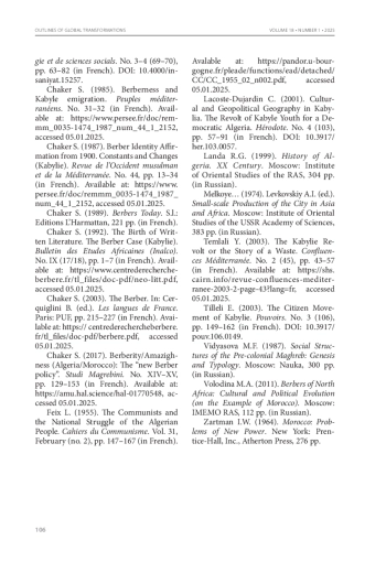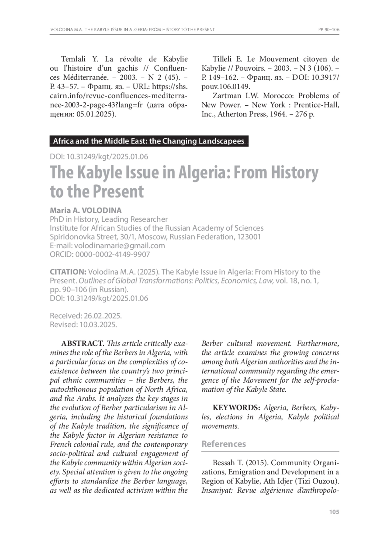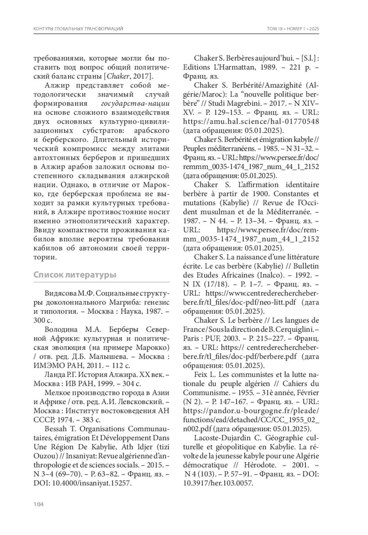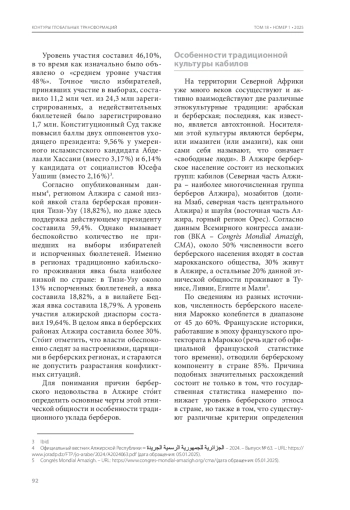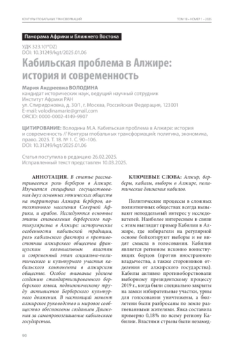 ВОЛОДИНА М. А. КАБИЛЬСКАЯ ПРОБЛЕМА В АЛЖИРЕ: ИСТОРИЯ И СОВРЕМЕННОСТЬ // КОНТУРЫ ГЛОБАЛЬНЫХ ТРАНСФОРМАЦИЙ: ПОЛИТИКА, ЭКОНОМИКА, ПРАВО. 2025. ТОМ 18, №1