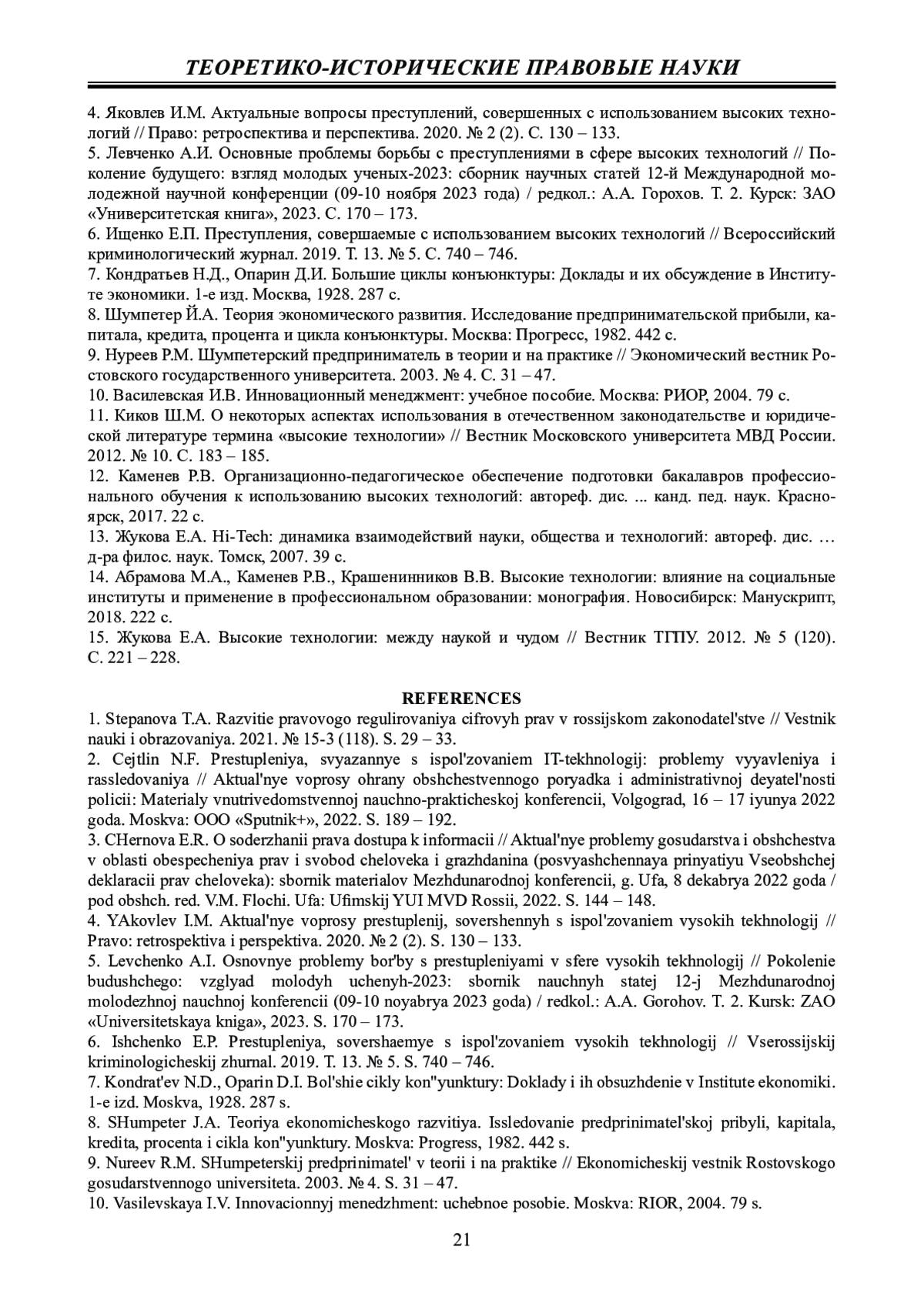 11. Киков Ш.М. О некоторых аспектах использования в отечественном законодательстве и юридической литературе термина “высокие технологии” // Вестник Московского университета МВД России. 2012. № 10. С. 183 - 185. EDN: PXKPCT