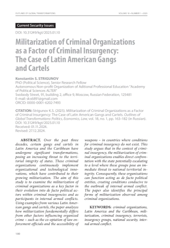 За последние три десятилетия некоторые банды и картели в Латинской Америке и Карибском бассейне (ЛАКБ) достигли новых эволюционных уровней, создав угрозу территориальной целостности государств. Эти преступные организации (ПО) непрерывно внедряют организационные и технологические инновации, что способствует их милитаризации. Цель данной работы на примере ряда латиноамериканских банд и картелей показать милитаризацию этих ПО как фактор их трансформации в де-факто политические субъекты криминального мятежа и участников внутреннего вооруженного конфликта. Установлено, что влияние милитаризации на эволюцию преступных организаций в условиях криминального мятежа коренным образом отличается от влияния на организованную преступность кооптации ею сотрудников силовых ведомств и получения преступниками доступа к вооружению в тех странах, где отсутствуют условия для криминального мятежа. Данный вывод основывается на том, что в криминальном мятеже милитаризация преступных организаций делает возможным прямое противодействие государству со стороны преступников вплоть до создания прямой угрозы его территориальной целостности. Вследствие этого преступные организации способны выступать в качестве де-факто политических субъектов, чем создаются условия для возникновения внутреннего вооруженного конфликта. Также выявлены основные типы милитаризации преступных организаций.