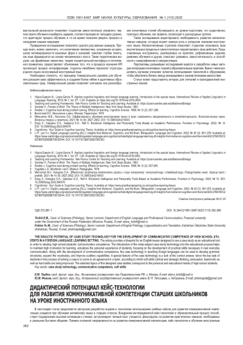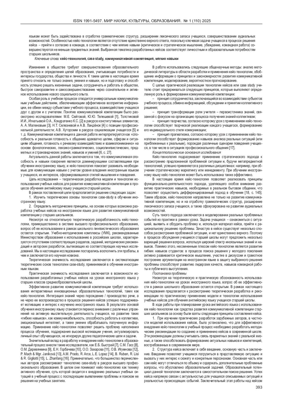 Статья: ДИДАКТИЧЕСКИЙ ПОТЕНЦИАЛ КЕЙС-ТЕХНОЛОГИИ ДЛЯ РАЗВИТИЯ КОММУНИКАТИВНОЙ КОМПЕТЕНЦИИ СТАРШИХ ШКОЛЬНИКОВ НА УРОКЕ ИНОСТРАННОГО ЯЗЫКА (2025)