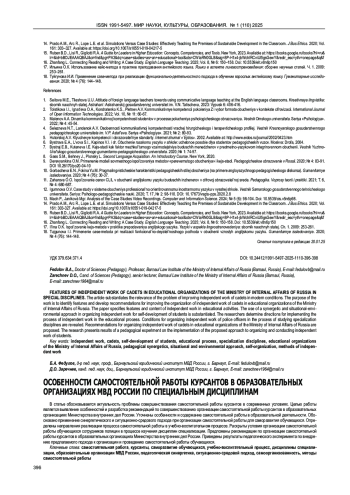 Ключевые фразы: САМОСТОЯТЕЛЬНАЯ РАБОТА, курсанты, саморазвитие обучающихся, учебно-воспитательный процесс, дисциплины специализации, ОБРАЗОВАТЕЛЬНЫЕ ОРГАНИЗАЦИИ МВД РОССИИ, педагогическая синергетика, ситуационно-средовой подход, самоорганизованность, методы самостоятельной работы
