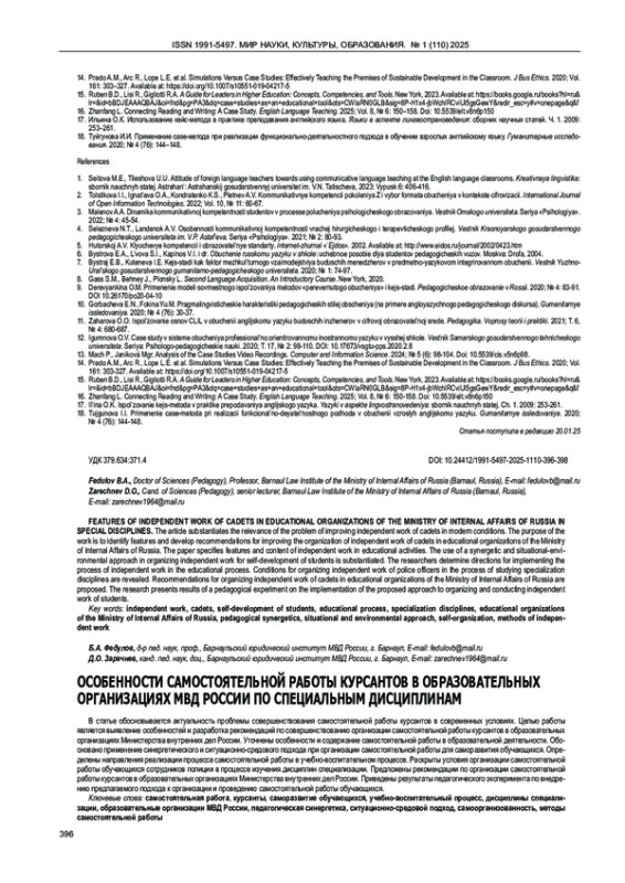 Статья: ОСОБЕННОСТИ САМОСТОЯТЕЛЬНОЙ РАБОТЫ КУРСАНТОВ В ОБРАЗОВАТЕЛЬНЫХ ОРГАНИЗАЦИЯХ МВД РОССИИ ПО СПЕЦИАЛЬНЫМ ДИСЦИПЛИНАМ (2025)