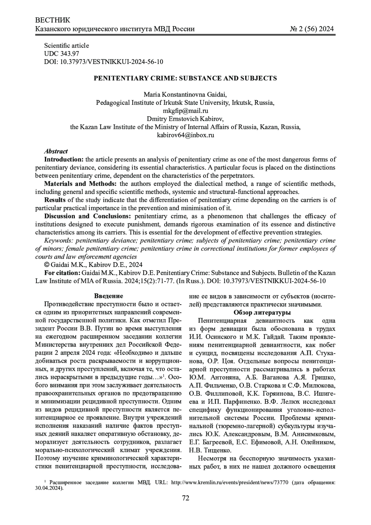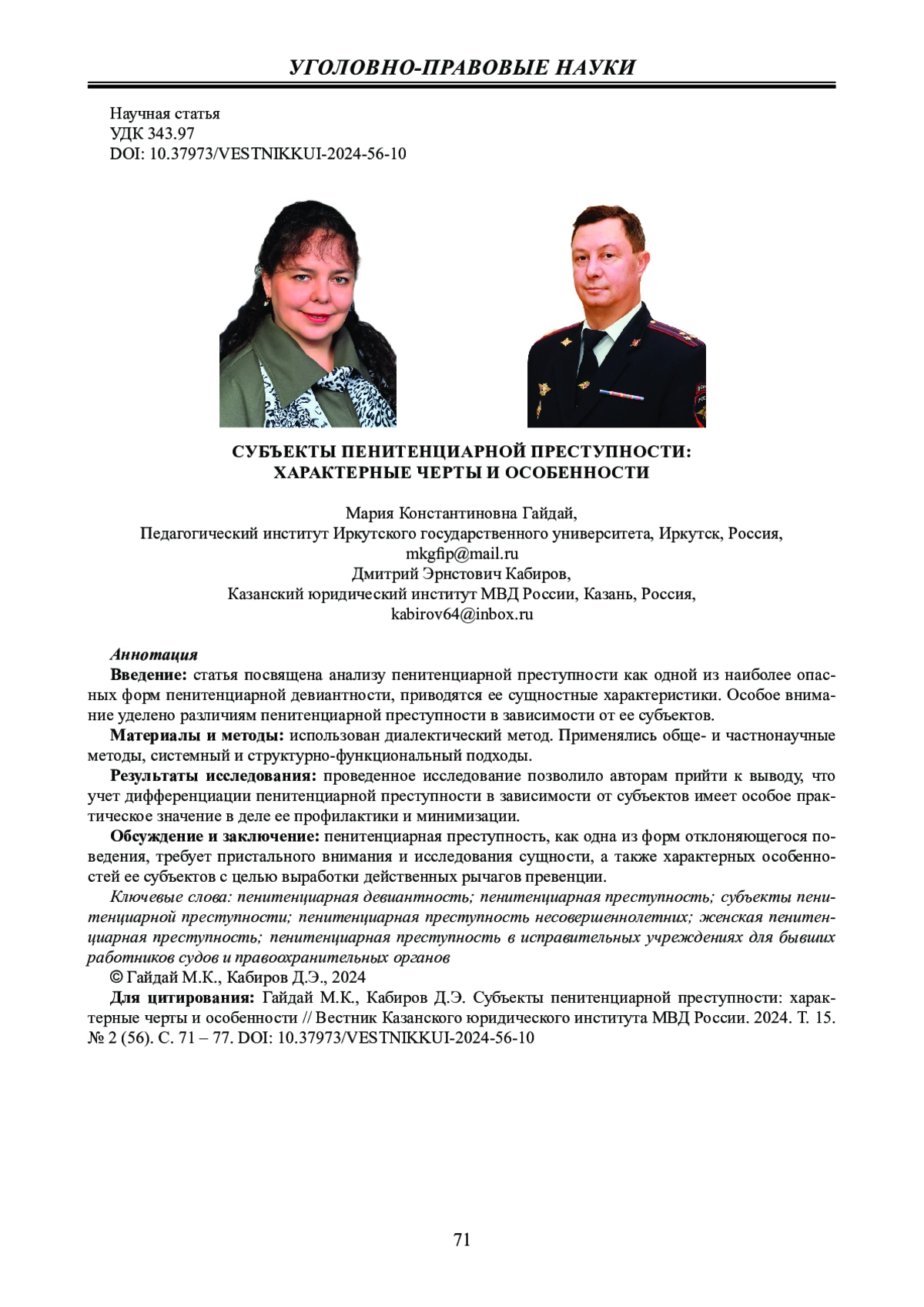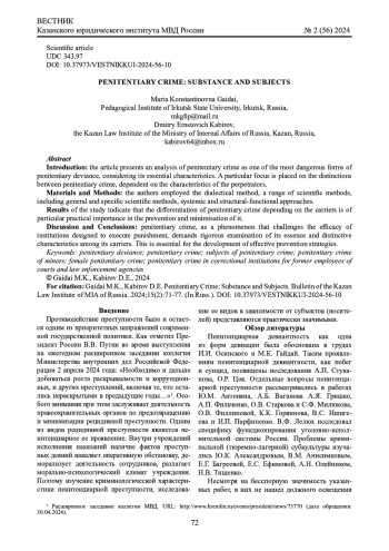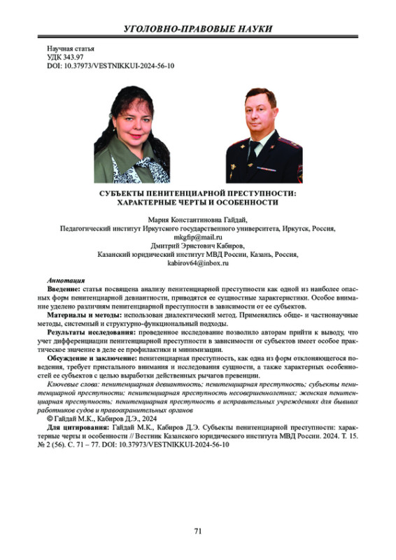 ГАЙДАЙ М. К., КАБИРОВ Д. Э. СУБЪЕКТЫ ПЕНИТЕНЦИАРНОЙ ПРЕСТУПНОСТИ: ХАРАКТЕРНЫЕ ЧЕРТЫ И ОСОБЕННОСТИ // ВЕСТНИК КАЗАНСКОГО ЮРИДИЧЕСКОГО ИНСТИТУТА МВД РОССИИ. 2024. Т. 15 № 2 (56)