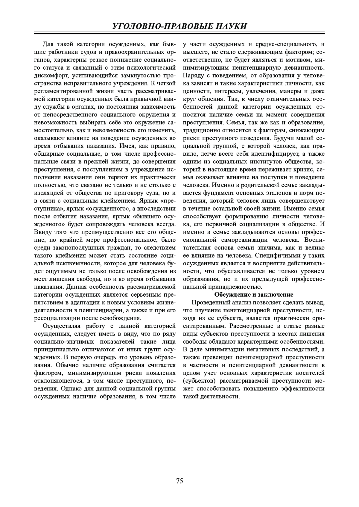 Обсуждение и заключение: пенитенциарная преступность, как одна из форм отклоняющегося поведения, требует пристального внимания и исследования сущности, а также характерных особенностей ее субъектов с целью выработки действенных рычагов превенции.
