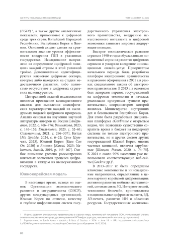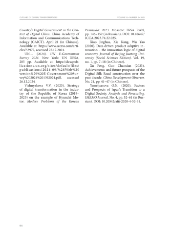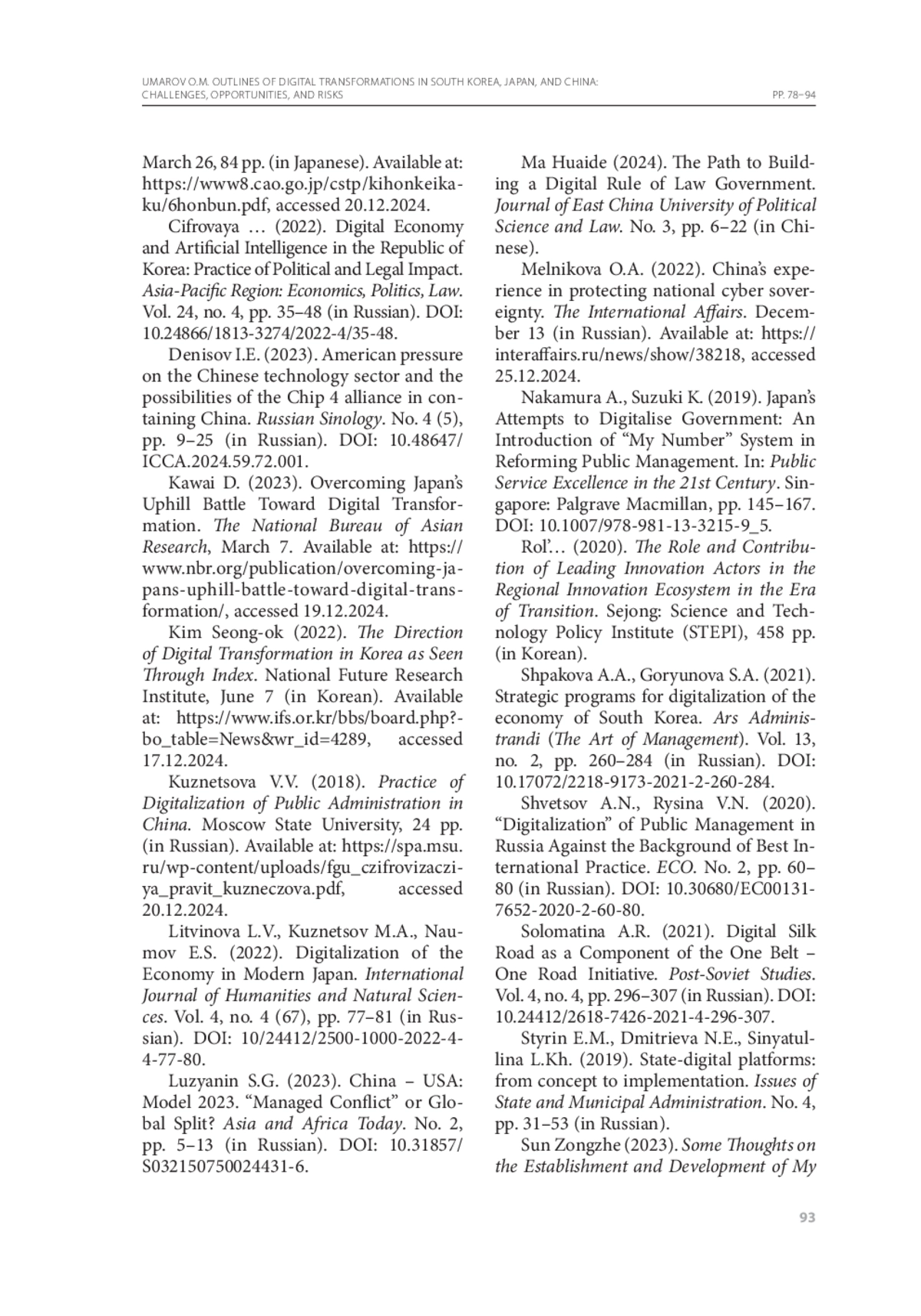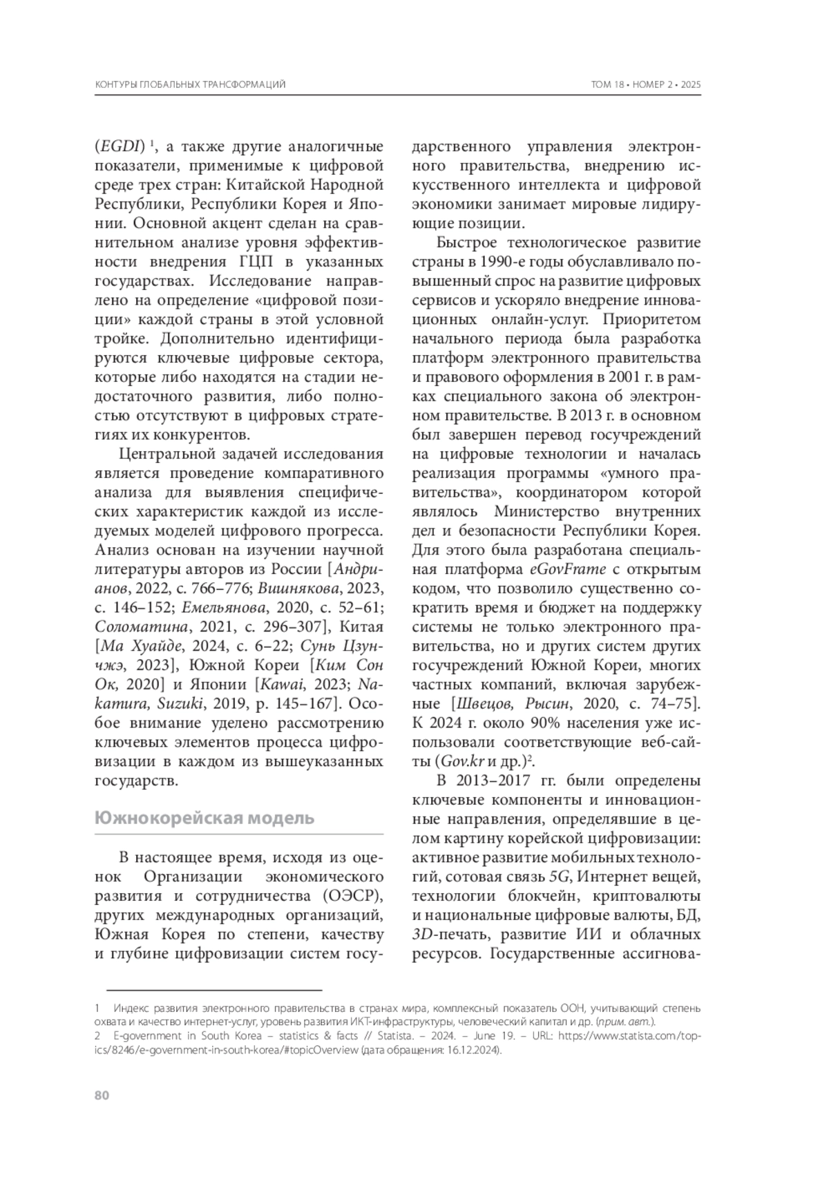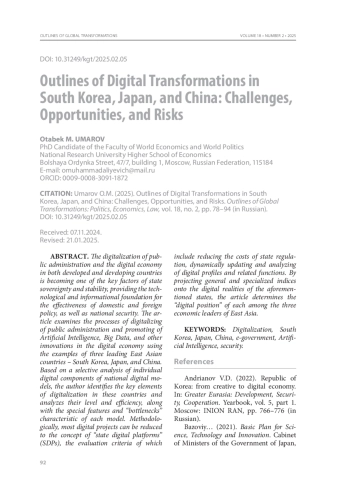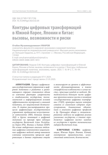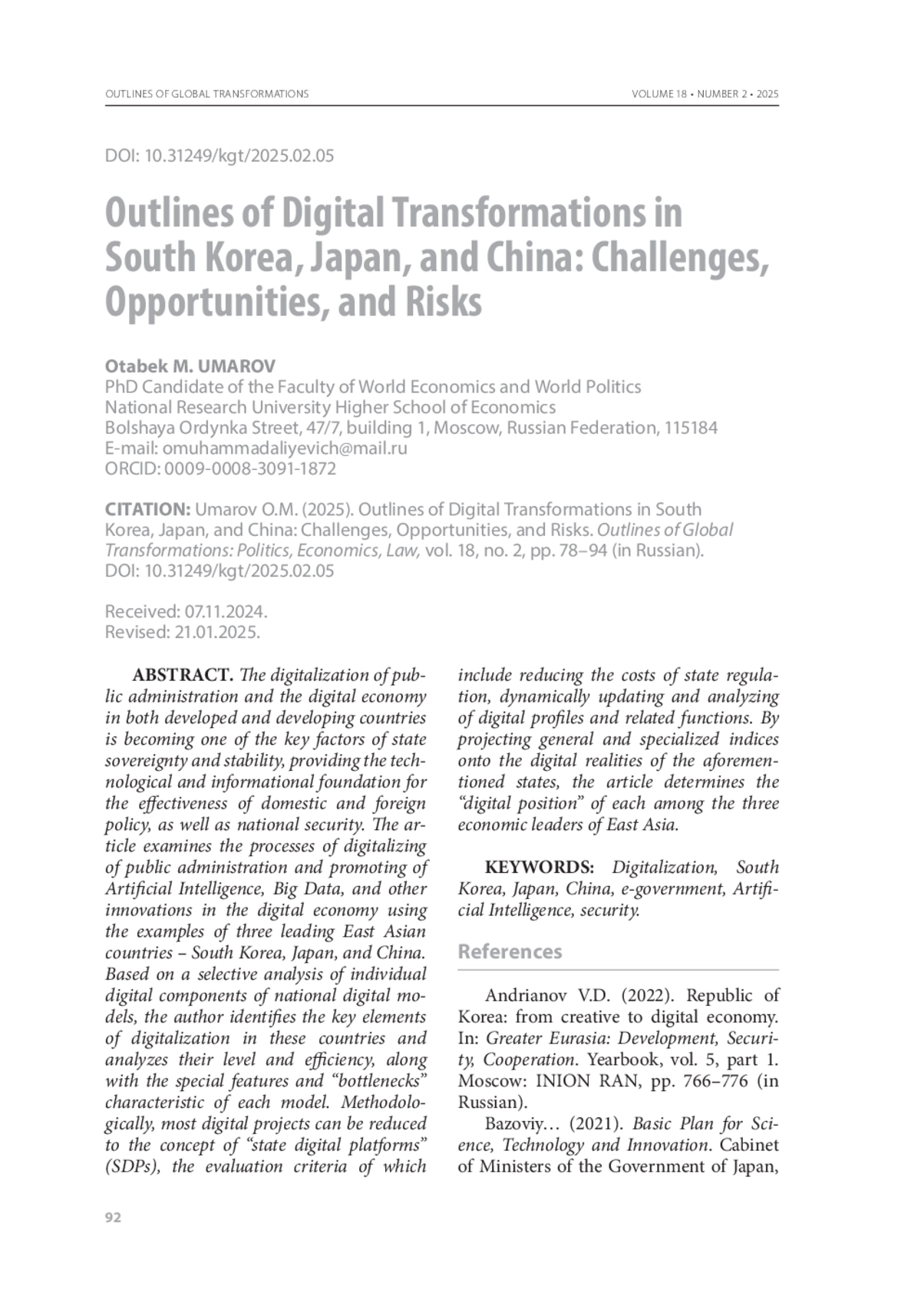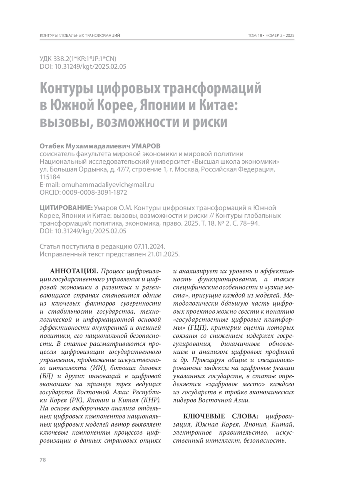 УМАРОВ О. М. КОНТУРЫ ЦИФРОВЫХ ТРАНСФОРМАЦИЙ В ЮЖНОЙ КОРЕЕ, ЯПОНИИ И КИТАЕ: ВЫЗОВЫ, ВОЗМОЖНОСТИ И РИСКИ // КОНТУРЫ ГЛОБАЛЬНЫХ ТРАНСФОРМАЦИЙ: ПОЛИТИКА, ЭКОНОМИКА, ПРАВО. 2025. ТОМ 18, №2