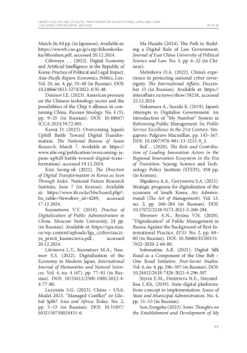 Процесс цифровизации государственного управления и цифровой экономики в развитых и развивающихся странах становится одним из ключевых факторов суверенности и стабильности государства, технологической и информационной основой эффективности внутренней и внешней политики, его национальной безопасности. В статье рассматриваются процессы цифровизации государственного управления, продвижение искусственного интеллекта (ИИ), больших данных (БД) и других инноваций в цифровой экономике на примере трех ведущих государств Восточной Азии: Республики Корея (РК), Японии и Китая (КНР). На основе выборочного анализа отдельных цифровых компонентов национальных цифровых моделей автор выявляет ключевые компоненты процессов цифровизации в данных страновых опциях и анализирует их уровень и эффективность функционирования, а также специфические особенности и «узкие места», присущие каждой из моделей. Методологически бо́льшую часть цифровых проектов можно свести к понятию «государственные цифровые платформы» (ГЦП), критерии оценки которых связаны со снижением издержек госрегулирования, динамичным обновлением и анализом цифровых профилей и др. Проецируя общие и специализированные индексы на цифровые реалии указанных государств, в статье определяется «цифровое место» каждого из государств в тройке экономических лидеров Восточной Азии.