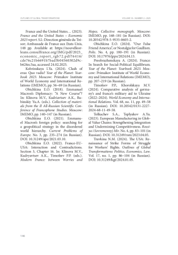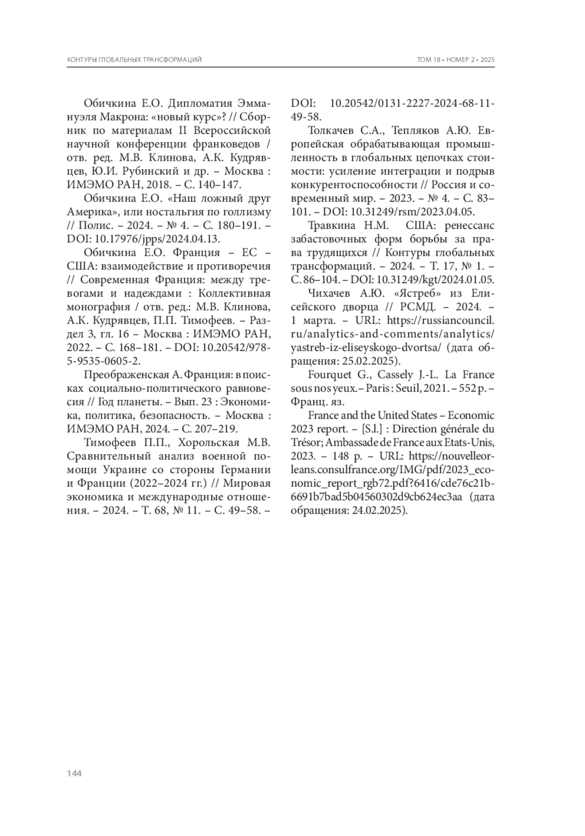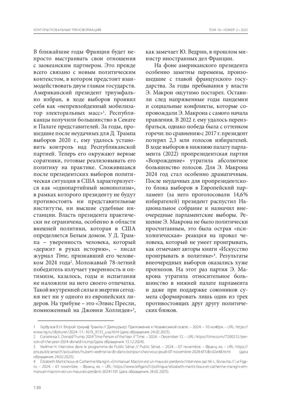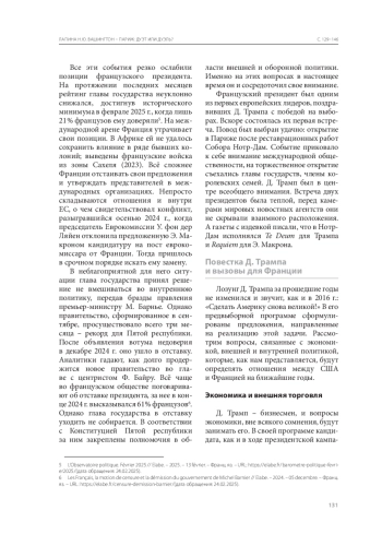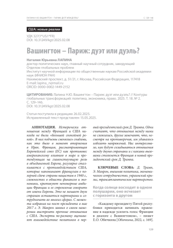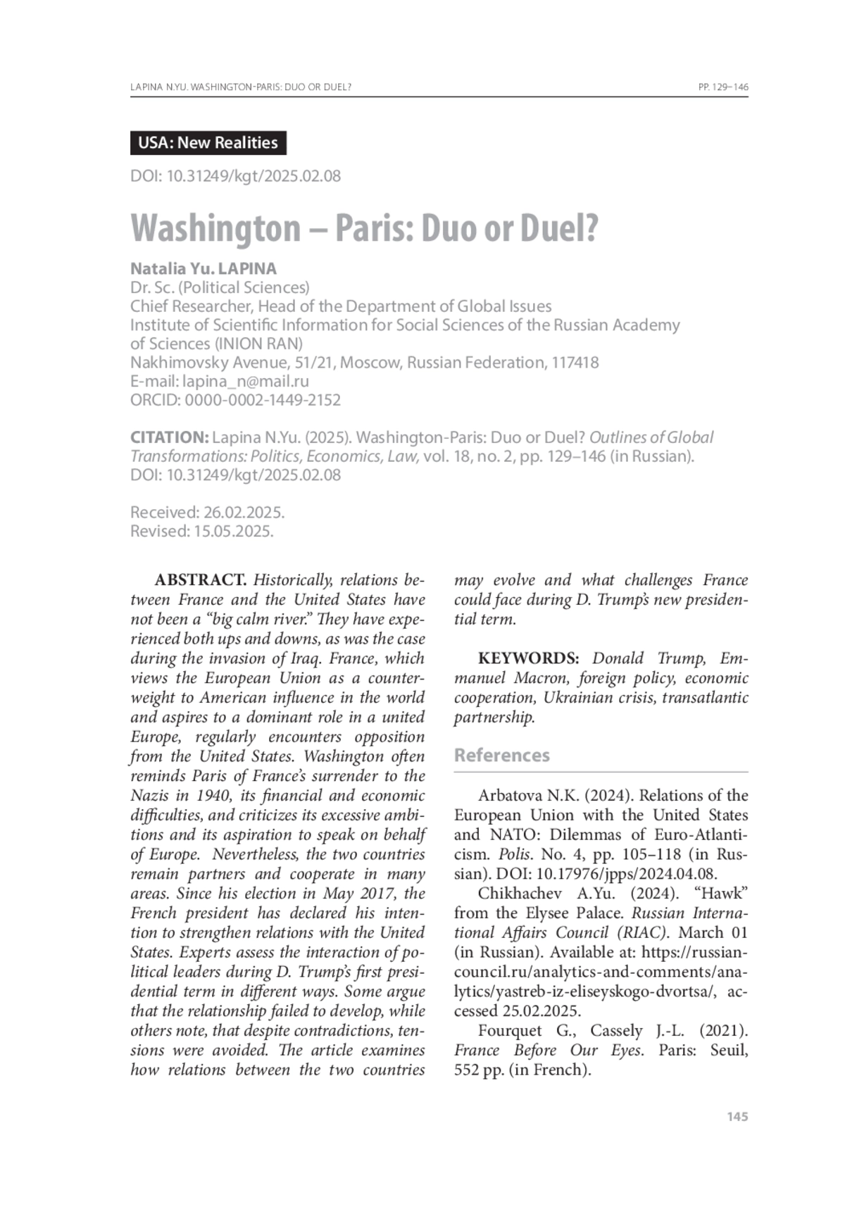 ЛАПИНА Н. Ю. ВАШИНГТОН – ПАРИЖ: ДУЭТ ИЛИ ДУЭЛЬ? // КОНТУРЫ ГЛОБАЛЬНЫХ ТРАНСФОРМАЦИЙ: ПОЛИТИКА, ЭКОНОМИКА, ПРАВО. 2025. ТОМ 18, №2