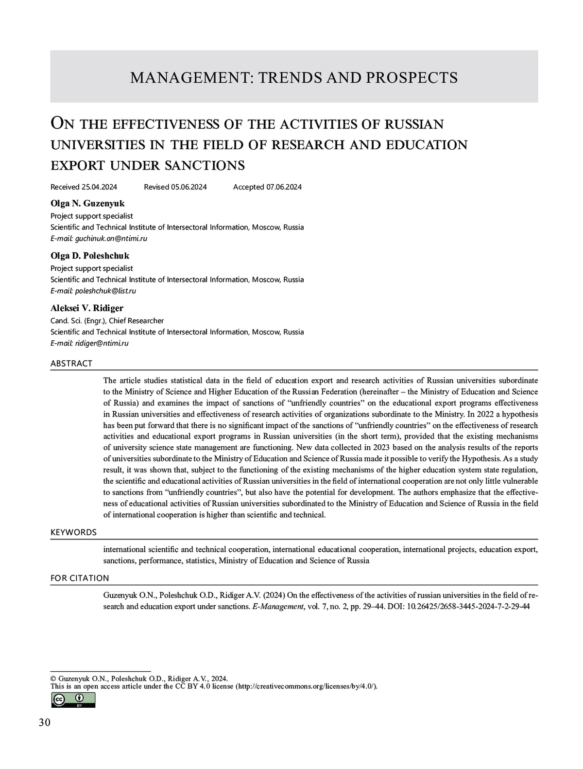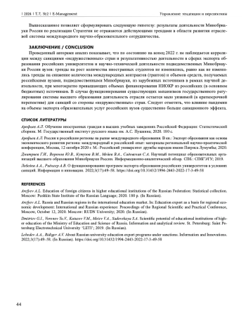 В статье рассматриваются данные статистики в области экспорта образования и научно-исследовательской деятельности российских университетов, подведомственных Министерству науки и высшего образования Российской Федерации (далее – Минобрнауки России), исследуется влияние санкций «недружественных стран» на результативность программ экспорта образования российских университетов и результативность научно-исследовательской деятельности подведомственных Министерству организаций. В 2022 г. была выдвинута гипотеза об отсутствии существенного влияния санкций «недружественных стран» на результативность научно-исследовательской деятельности и программ экспорта образования российских университетов (в краткосрочном периоде) при условии функционирования существующих механизмов государственного управления вузовской наукой. Новые данные, собранные в 2023 г. по результатам анализа отчетности подведомственных Минобрнауки России вузов, позволили осуществить проверку Гипотезы. В результате работы было показано, что при условии функционирования действующих механизмов государственного регулирования системы высшего образования научно-образовательная деятельность российских вузов в области международного сотрудничества не только мало уязвима для санкций со стороны «недружественных стран», но и имеет потенциал для развития. Авторами подчеркивается, что результативность образовательной деятельности российских вузов, подведомственных Минобрнауки России, в области международного сотрудничества выше, чем в научно-технической.