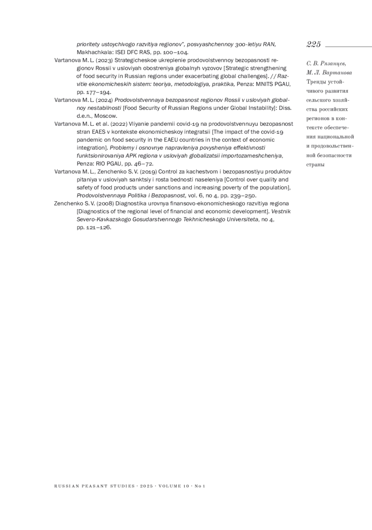 9. Вартанова М. Л. (2024). Продовольственная безопасность регионов России в условиях глобальной нестабильности: дисс. … д-ра экон. наук (5.2.3). Москва. EDN: BXWZEG