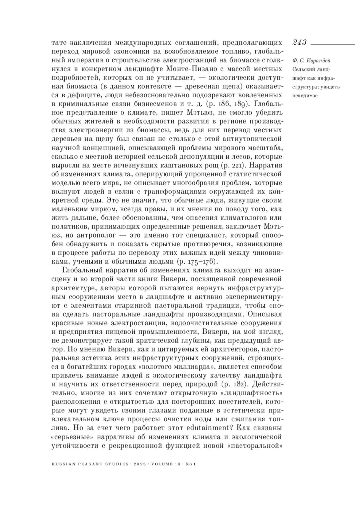 Трансформации, которые происходят в сельском ландшафте, такие как депопуляция и сжатие обрабатываемых земель в одних районах, превращение других в районы интенсивного агропромышленного производства, формирование новых типов ландшафта, населения, природно-антропогенных явлений1, заставляют задуматься о связи ландшафта с инфраструктурой. Восприятие нашими информантами лесных пожаров начала 2020-х годов, которое мы фиксировали в сельских районах Тюменской области, очень напоминало восприятие местными жителями пожаров 2010-х годов в итальянской Тоскане, описанное антропологом Эндрю Мэтьюзом, о книге которого речь пойдет ниже. «Что-то пошло не так, раньше такого не было, кто-то (обычно производящее реформы государство) виноват, нужно что-то с этим делать!» — помимо всего прочего, такие комментарии — свидетельство восприятия местными жителями ландшафта как производящей аграрной инфраструктуры