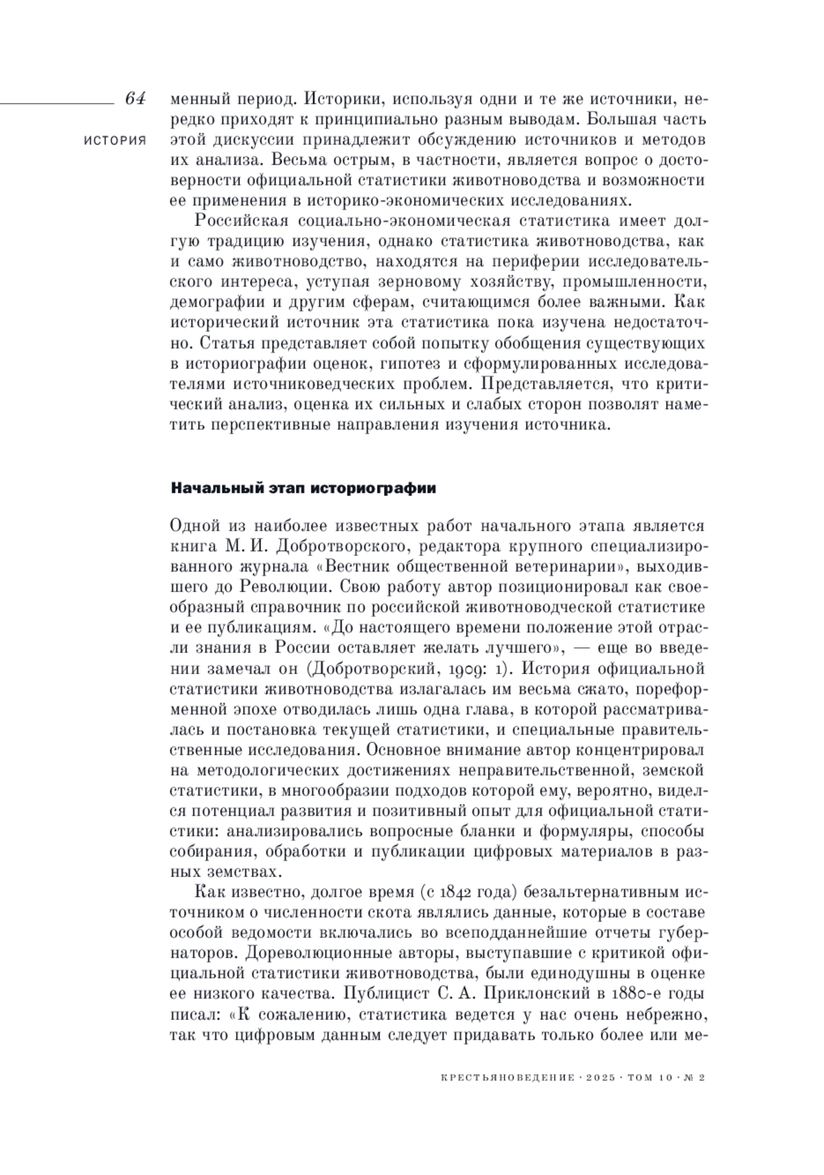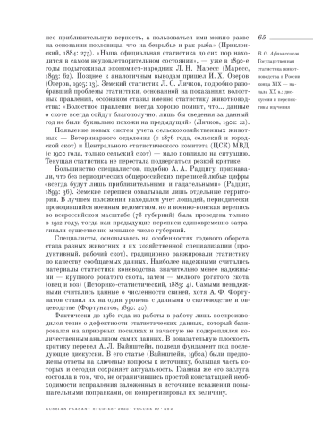 В статье анализируются исследовательские подходы, гипотезы и оценки дореволюционной статистики животноводства, представленные в историографии. На раннем этапе в экспертном сообществе господствовало убеждение в низкой достоверности этой статистики, хотя большинство исследователей признавали ее пригодной для изучения динамики и географического размещения поголовья скота. Этап научного ретроспективного анализа начался с работы А. Л. Вайнштейна 1960 года, в которой данные текущего статистического учета сравнивались с итогами сельскохозяйственной переписи 1916 года. Вайнштейн предложил метод корректировки текущих данных и повышательные поправки к ним. Он же поставил вопросы о сопоставимости статистики Ветеринарного управления до и после 1896 года, о сопоставимости данных Центрального статистического комитета и Ветеринарного управления МВД. Новейший этап историографии относится к дискуссии «оптимистов» и «пессимистов» 2000-х годов. Наиболее обоснованной в этой дискуссии представляется гипотеза С. А. Нефедова о том, что текущая статистика до революции полноценно учитывала только взрослое поголовье скота, в отличие от переписи 1916 года, зарегистрировавшей молодняк. Ни один из исследовательских вопросов, сформулированных в историографии, не получил окончательного разрешения. В частности, недостаточно изучены возможности использования данных о поголовье скота для реконструкции объемов производства продуктов животноводства. Новым аспектом исследования может стать взгляд на статистику как на элемент системы государственного управления.