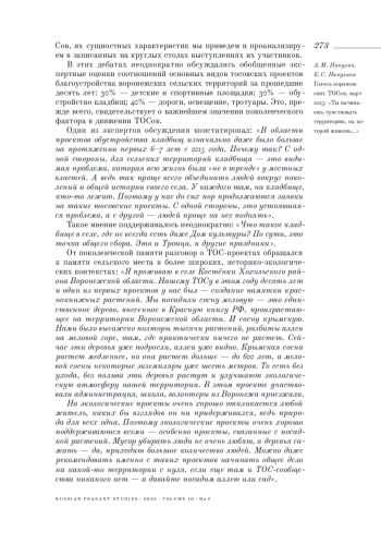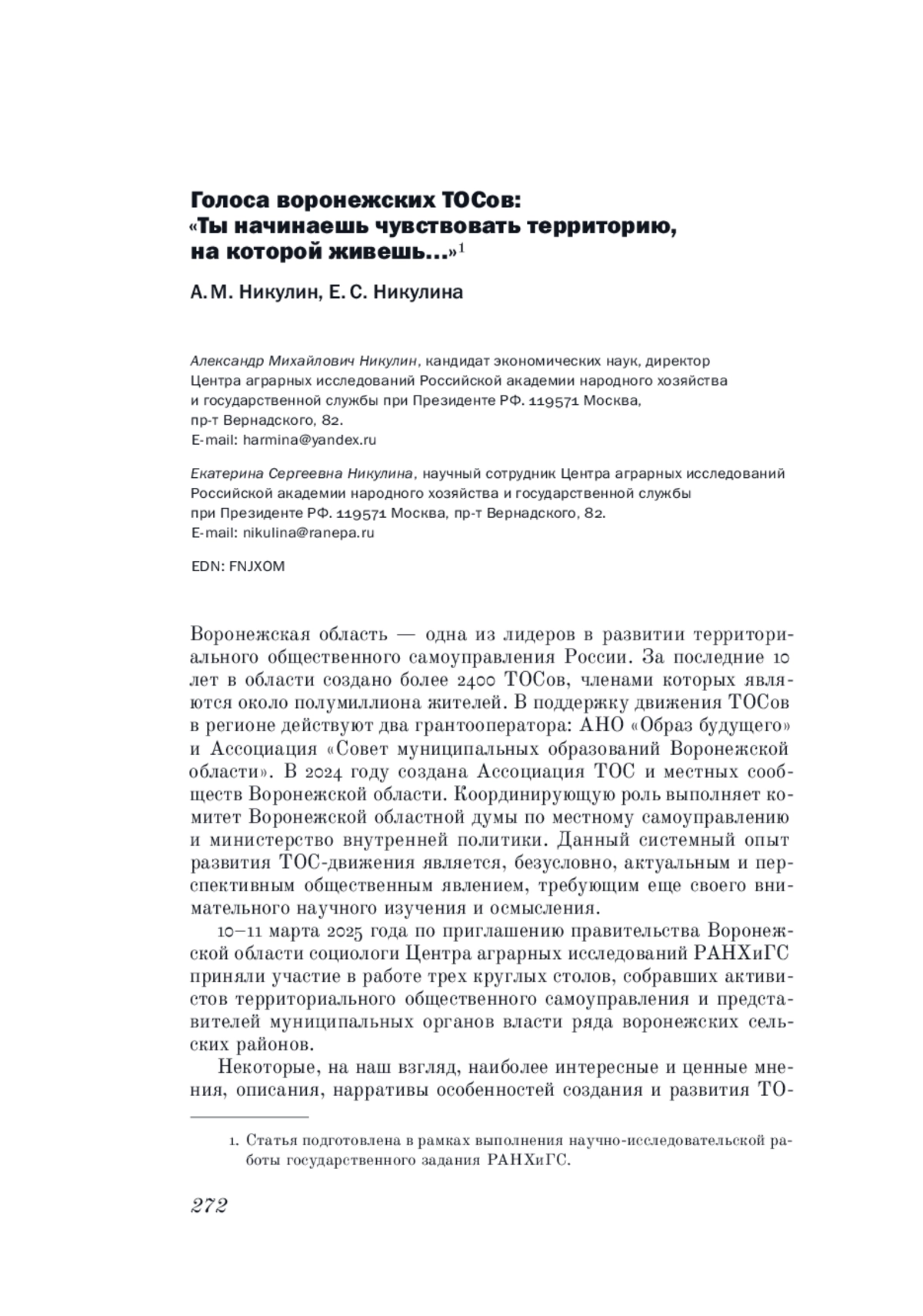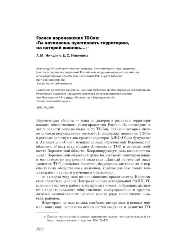 Воронежская область — одна из лидеров в развитии территориального общественного самоуправления России. За последние 10 лет в области создано более 2400 ТОСов, членами которых являются около полумиллиона жителей. В поддержку движения ТОСов в регионе действуют два грантооператора: АНО «Образ будущего» и Ассоциация «Совет муниципальных образований Воронежской области». В 2024 году создана Ассоциация ТОС и местных сообществ Воронежской области. Координирующую роль выполняет комитет Воронежской областной думы по местному самоуправлению и министерство внутренней политики. Данный системный опыт развития ТОС-движения является, безусловно, актуальным и перспективным общественным явлением, требующим еще своего внимательного научного изучения и осмысления