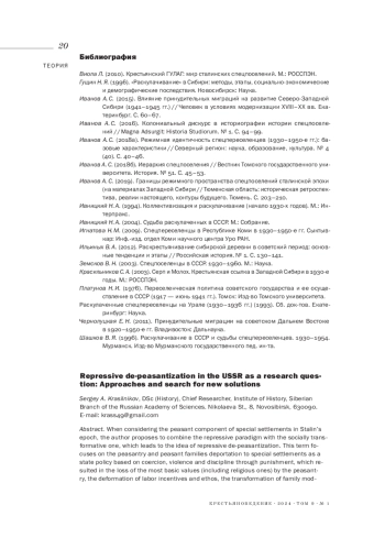 КРАСИЛЬНИКОВ С. А. РЕПРЕССИВНОЕ РАСКРЕСТЬЯНИВАНИЕ В СССР КАК ИССЛЕДОВАТЕЛЬСКАЯ ПРОБЛЕМА: ПОДХОДЫ И ПОИСКИ НОВЫХ РЕШЕНИЙ // КРЕСТЬЯНОВЕДЕНИЕ. 2024. Т. 9 № 1