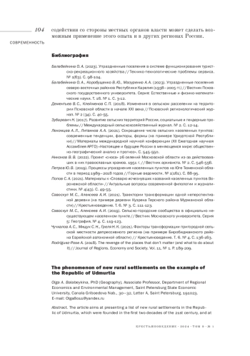 5. Лекомцев А. Л., Литвинов А. А. (2021). Сокращение числа сельских населенных пунктов: современные тенденции, факторы, формы (на примере Удмуртской Республики) // Материалы международной научной конференции (XII Ежегодная научная Ассамблея АРГО) “Настоящее и будущее России в меняющемся мире: общественно-географический анализ и прогноз”. С. 545-550. EDN: RFSTXS