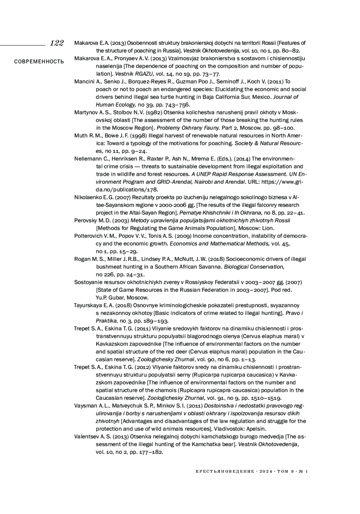 37. Muth R. M., Bowe J. F. (1998). Illegal Harvest of Renewable Natural Resources in North America: Toward a Typology of the Motivations for Poaching // Society & Natural Resources. № 11. P. 9-24.