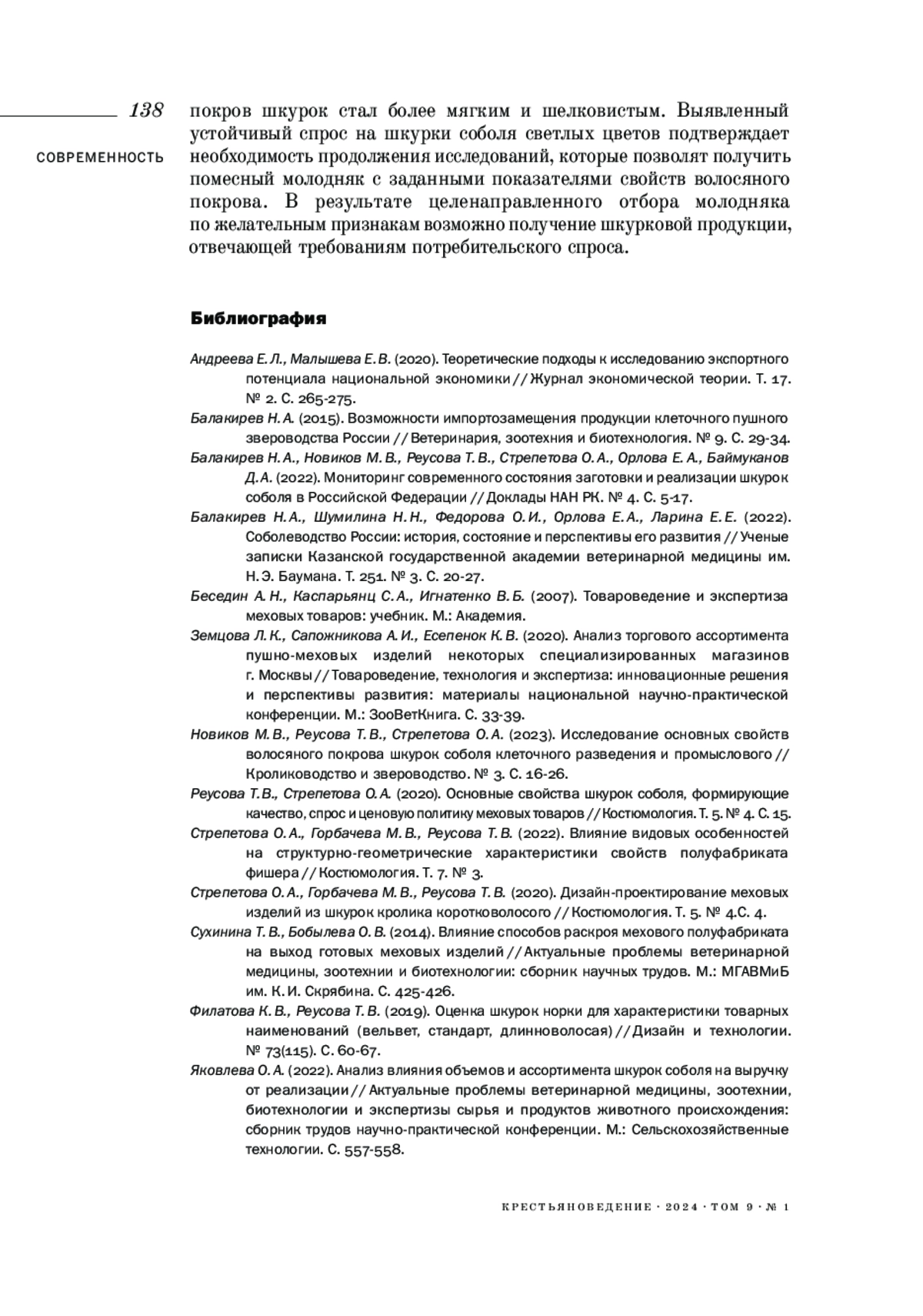7. Новиков М. В., Реусова Т. В., Стрепетова О. А. (2023). Исследование основных свойств волосяного покрова шкурок соболя клеточного разведения и промыслового // Кролиководство и звероводство. № 3. С. 16-26. EDN: DOIOCA