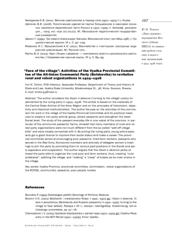 Несмотря на то что изучению политики коммунистической партии и государства по отношению к крестьянству в годы НЭПа посвяще - но большое количество научных работ, тема продолжает вызывать устойчивый интерес российских исследователей, что обусловлено, помимо прочего, множеством региональных особенностей в развитии нэповской деревни. Наша работа относится к истории Вятской губернии и охватывает лишь период 1924–1926 годов, когда политика по отношению к крестьянству осуществлялась под лозунгом «лицом к деревне».