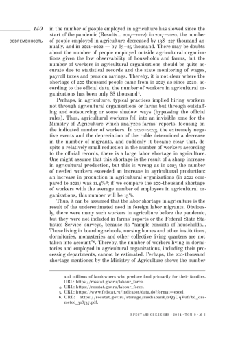 5. Kisly O. A., Isaeva M. A. (2023) The situation of labor migrants in Russian agriculture under the pandemic. URL: https://cyberleninka.ru/article/n/polozhenie-trudovyh-migrantov-v-period-pandemii-v-selskom-hozyaystve-rossii/viewer. (In Russian).