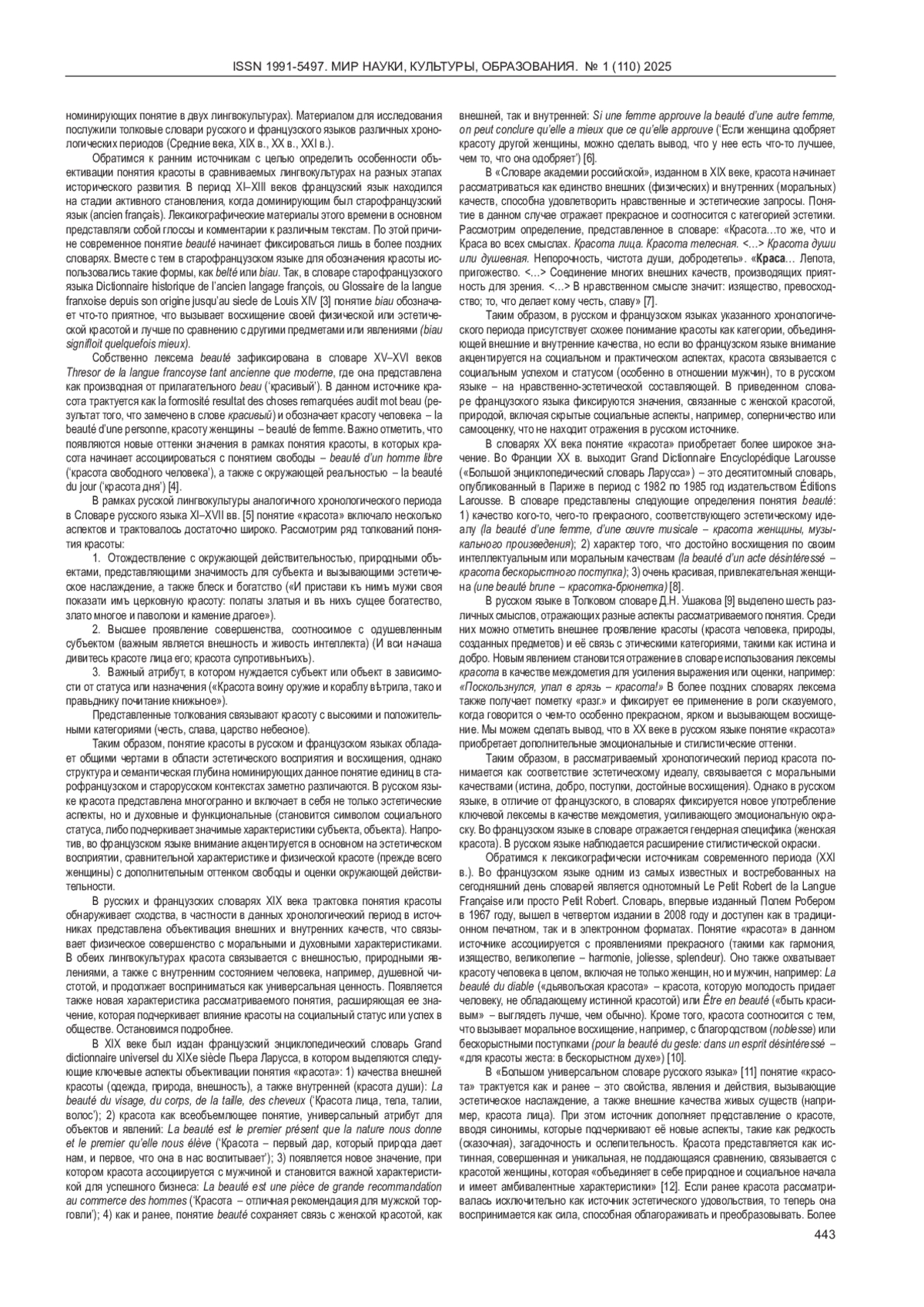В данной статье рассматриваются особенности толкования понятия красоты в русском и французском языках, отражающие динамику семантических изменений ключевых лексем красота и beaute. В результате анализа русских и французских лексикографических источников разных хронологических периодов прослеживается расширение и усложнение понятия «красота», выделяются конкретные объекты и явления, выступающие в качестве эталонов для объективации данного понятия. Устанавливается следующая закономерность: в ранних источниках понятие красоты как в русском, так и во французском языках соотносилось преимущественно с физической красотой и гармонией, в последующие периоды оно становится отражением и внутреннего (нравственного и духовного) совершенства. Определено, что в русской лингвокультуре, по сравнению с французской, красота представляет собой комплексное и многослойное понятие, сочетающее внешние и внутренние качества. Сделан вывод о трансформации понятия на разных этапах его исторического развития. Отмечено, что отдельные признаки понятия красоты в обеих лингвокультурах уходят в прошлое, появляются новые, обусловленные историческими, социально-культурными изменениями, ролью идеалов и символов в конкретной культуре.
