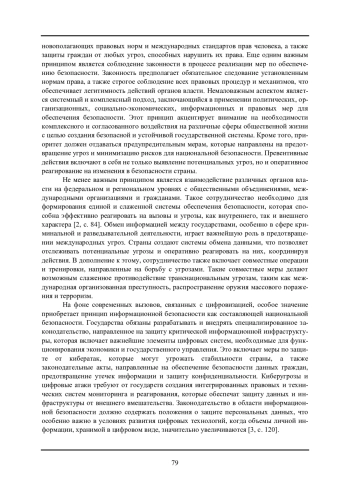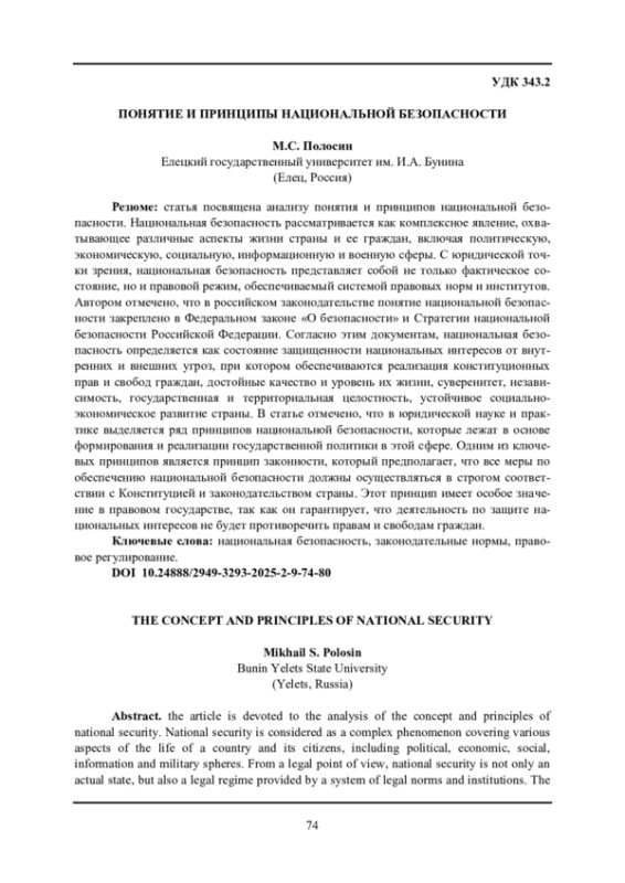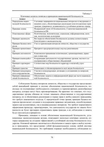 Статья посвящена анализу понятия и принципов национальной безопасности. Национальная безопасность рассматривается как комплексное явление, охватывающее различные аспекты жизни страны и ее граждан, включая политическую, экономическую, социальную, информационную и военную сферы. С юридической точки зрения, национальная безопасность представляет собой не только фактическое состояние, но и правовой режим, обеспечиваемый системой правовых норм и институтов. Автором отмечено, что в российском законодательстве понятие национальной безопасности закреплено в Федеральном законе «О безопасности» и Стратегии национальной безопасности Российской Федерации. Согласно этим документам, национальная безопасность определяется как состояние защищенности национальных интересов от внутренних и внешних угроз, при котором обеспечиваются реализация конституционных прав и свобод граждан, достойные качество и уровень их жизни, суверенитет, независимость, государственная и территориальная целостность, устойчивое социально-экономическое развитие страны. В статье отмечено, что в юридической науке и практике выделяется ряд принципов национальной безопасности, которые лежат в основе формирования и реализации государственной политики в этой сфере. Одним из ключевых принципов является принцип законности, который предполагает, что все меры по обеспечению национальной безопасности должны осуществляться в строгом соответствии с Конституцией и законодательством страны. Этот принцип имеет особое значение в правовом государстве, так как он гарантирует, что деятельность по защите национальных интересов не будет противоречить правам и свободам граждан.