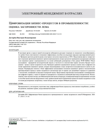 2. Дегтярева В.В., Плугарь М.С. Совершенствование бизнес-процесса оценки засоренности металлолома на основе вне дрения цифровых инструментов. Russian Economic Bulletin. 2023;2(6):205-211.