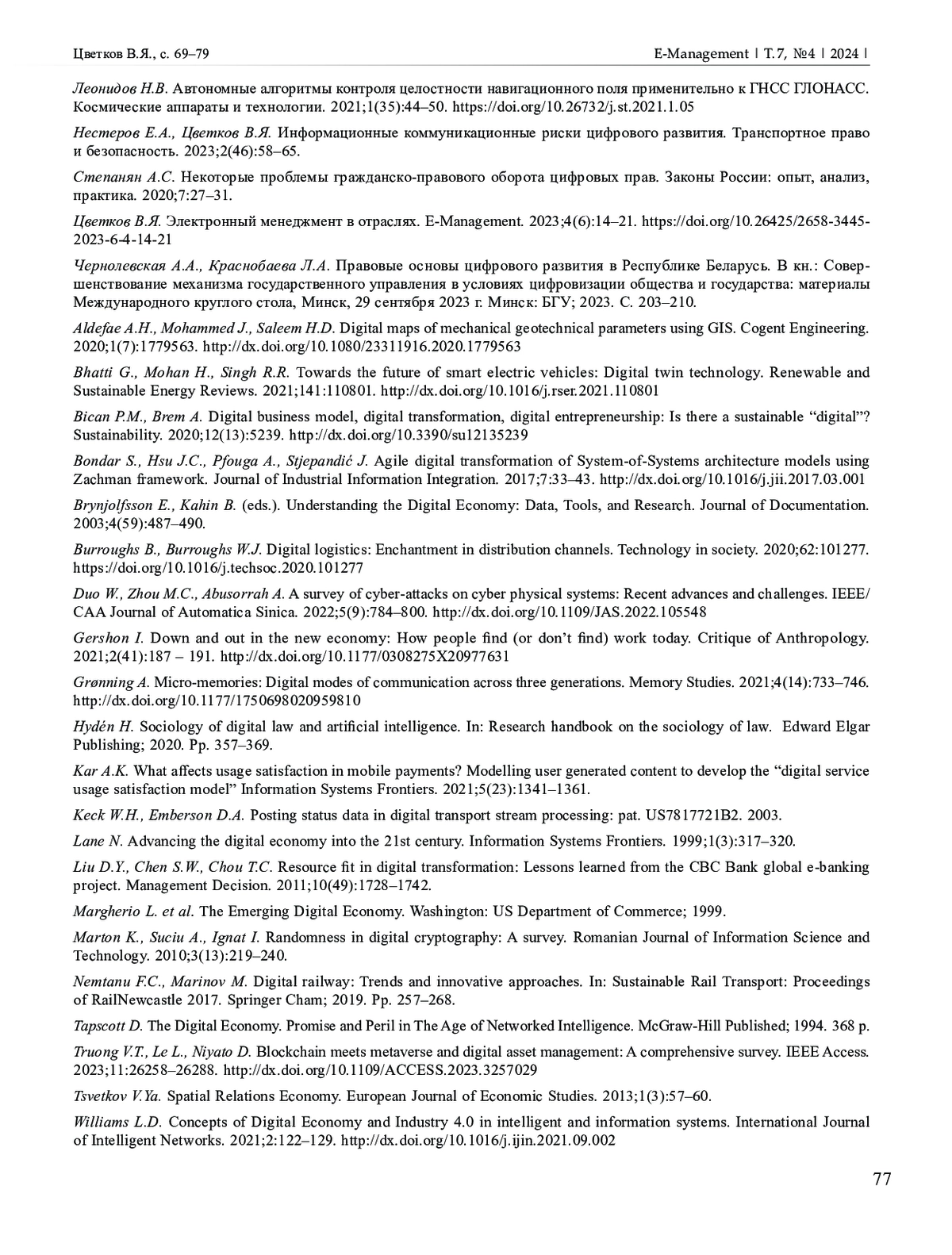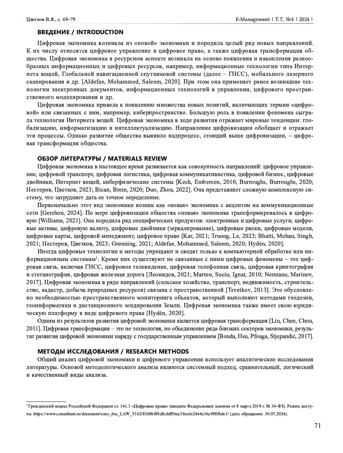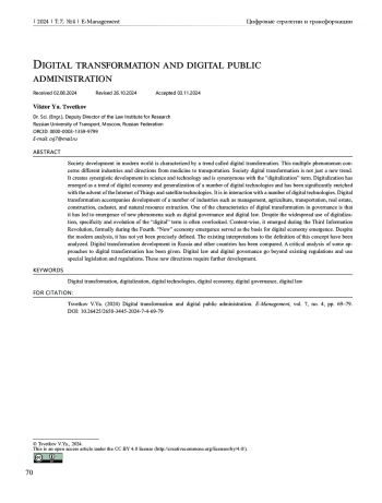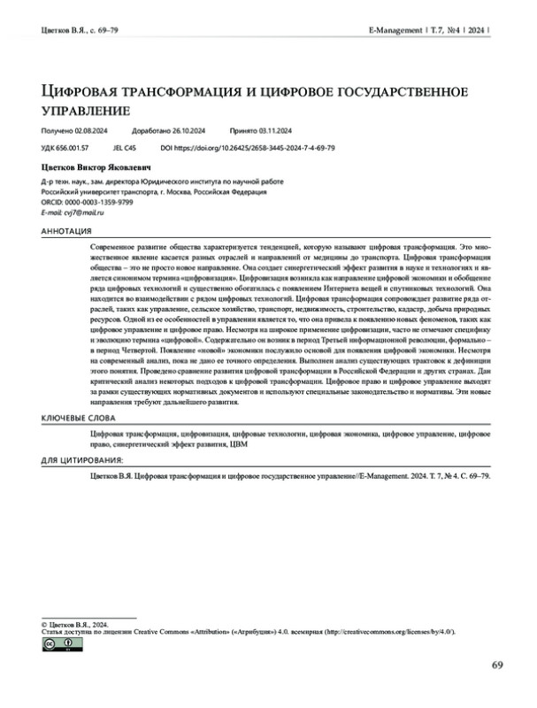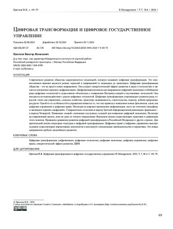 ЦВЕТКОВ В. Я. ЦИФРОВАЯ ТРАНСФОРМАЦИЯ И ЦИФРОВОЕ ГОСУДАРСТВЕННОЕ УПРАВЛЕНИЕ // E-MANAGEMENT. 2024. Т. 7 № 4