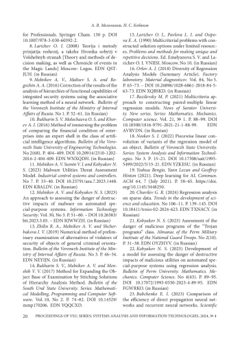 17. Базилевский М. П. Многокритериальный подход к построению моделей парно-множественной линейной регрессии / М. П. Базилевский // Известия Саратовского университета. Новая серия. Серия: Математика. Механика. Информатика. - 2021. - Т. 21, № 1. - С. 88-99. DOI: 10.18500/1816-97912021-21-1-88-99 EDN: AVRVDN