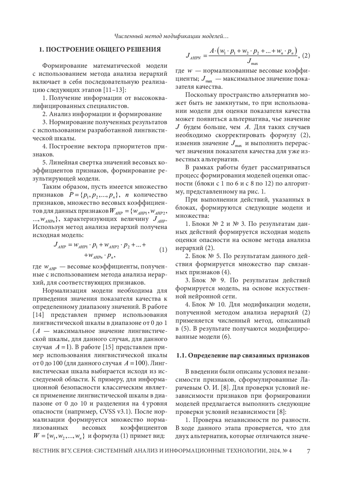 В статье рассматривается процесс формирования моделей для оценки показателя качества с использованием метода анализа иерархий, в предметных областях, которые характеризуются связанными признаками. Применение классического метода анализа иерархий не позволяет формировать модели со связанными признаками. Целью работы является разработка и верификация численного метода, который позволит модифицировать модели, сформированные с использованием метода анализа иерархий и увеличить их точность благодаря учету связи признаков. Верификация разработанного метода выполнена на примере формирования моделей оценки опасности деструктивных программных воздействий вредоносных программ класса вредоносные утилиты на автоматизированные системы специального назначения органов внутренних дел. На основе метода анализа иерархий, исходя из результатов опроса специалистов в области обеспечения информационной безопасности, сформирована исходная модель. Выявлены связанные поведенческие паттерны вредоносных утилит, совместная реализация которых, приводит к повышению значения показателя опасности исследуемой альтернативы. Для исследования связанных признаков сформирована искусственная нейронная сеть прямого распространения. Гиперпараметры искусственной нейронной сети определены таким образом, чтобы получить достаточную точность при верификации. Разработан численный метод, позволяющий учитывать связанные признаки в моделях, разработанных с использованием метода анализа иерархий. С использованием численного метода выполнена модификация и верификация исходной модели. Для верификации модели использовался тестовый набор данных, сформированный в ходе опроса экспертов. Верификация численного метода показала непротиворечивость полученных результатов. Результаты исследования могут быть использованы специалистами для формирования моделей оценки показателя качества, при связанных признаках.