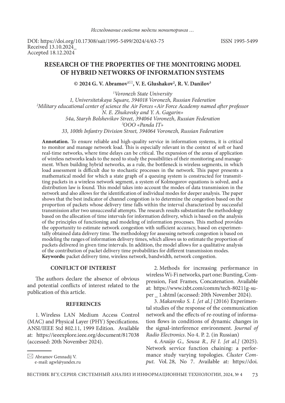 11. Абрамов Г. В. Модель системы мониторинга передачи данных в гибридных сетях / Г. В. Абрамов, В. Е. Глушаков // Вестник Воронежского института ФСИН России. - 2024. - № 3. - С. 14-21. EDN: FNFJYK
