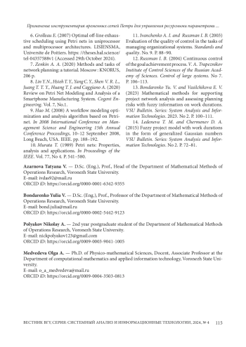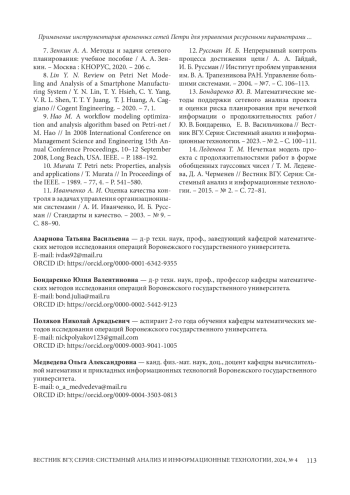 АЗАРНОВА Т. В., БОНДАРЕНКО Ю. В., ПОЛЯКОВ Н. А., МЕДВЕДЕВА О. А. ПРИМЕНЕНИЕ ИНСТРУМЕНТАРИЯ ВРЕМЕННЫХ СЕТЕЙ ПЕТРИ ДЛЯ УПРАВЛЕНИЯ РЕСУРСНЫМИ ПАРАМЕТРАМИ ПРОЕКТА // ВЕСТНИК ВОРОНЕЖСКОГО ГОСУДАРСТВЕННОГО УНИВЕРСИТЕТА. СЕРИЯ: СИСТЕМНЫЙ АНАЛИЗ И ИНФОРМАЦИОННЫЕ ТЕХНОЛОГИИ. 2024. № 4