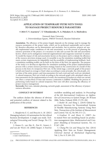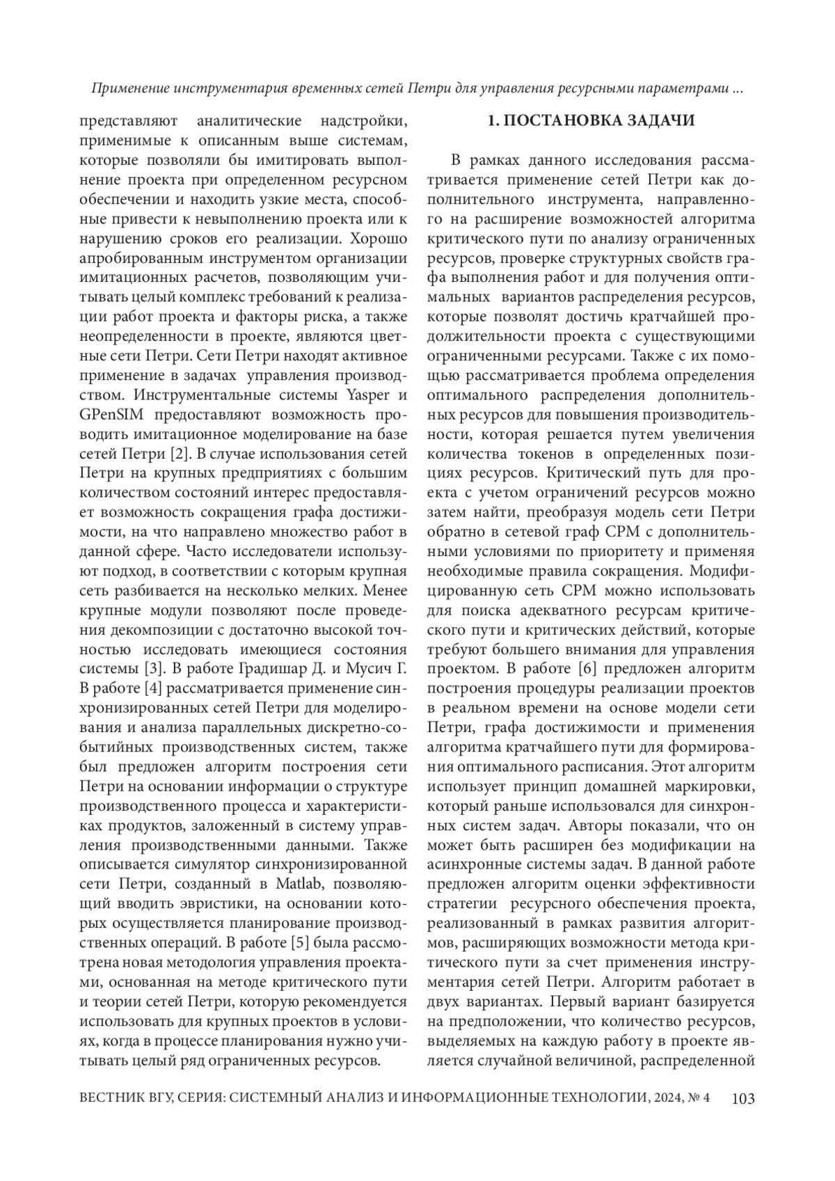 Статья: ПРИМЕНЕНИЕ ИНСТРУМЕНТАРИЯ ВРЕМЕННЫХ СЕТЕЙ ПЕТРИ ДЛЯ УПРАВЛЕНИЯ РЕСУРСНЫМИ ПАРАМЕТРАМИ ПРОЕКТА (2024)
