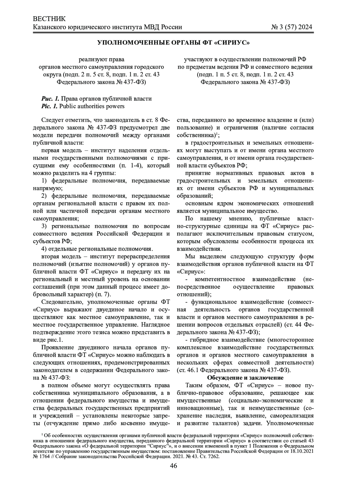 Результаты исследования: представлена научная аргументация исследователей об определении полномочий органов публичной власти на указанной территориальной единице; дана авторская позиция по структуре взаимоотношений органов публичной власти на ФТ «Сириус».