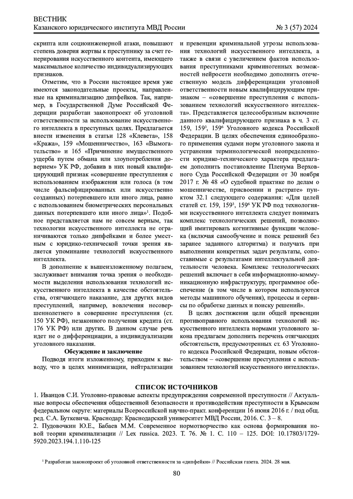7. Ефремова М.А., Русскевич Е.А. Дипфейк (deepfake) и уголовный закон // Вестник Казанского юридического института МВД России. 2024. Т. 15. № 2 (56). С. 97 - 105. DOI: 10.37973/VESTNIKKUI-2024-56-13 EDN: LXAWLM