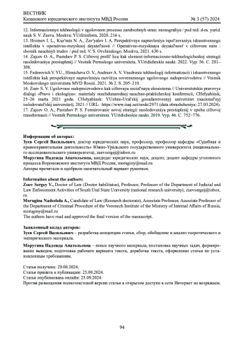 14. Зайцев О. А., Пастухов П. С. Цифровой профиль лица как элемент информационно-технологической стратегии расследования преступлений // Вестник Пермского университета. Юридические науки. 2022. Вып. 56. C. 281-308. EDN: TBDSEX