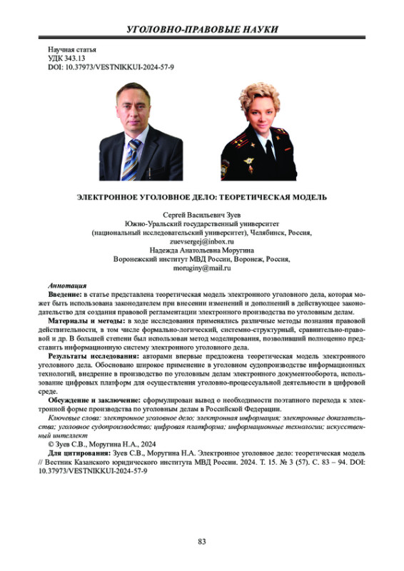 Введение: в статье представлена теоретическая модель электронного уголовного дела, которая может быть использована законодателем при внесении изменений и дополнений в действующее законодательство для создания правовой регламентации электронного производства по уголовным делам.