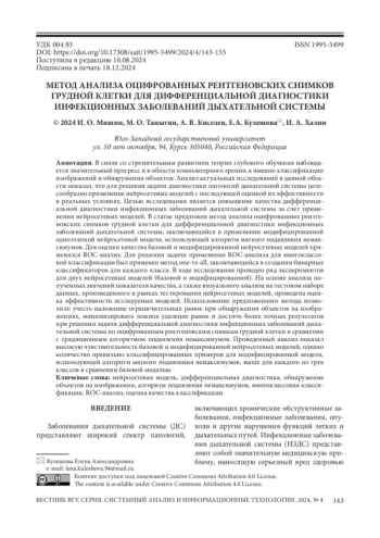 В клинической практике для диагностики и контроля эффективности лечения пневмонии и туберкулеза широко применяется метод рентгенологического исследования органов грудной клетки. Анализ рентгеновских снимков грудной клетки врачом представляет собой сложный и трудоемкий процесс, требующий высокой профессиональной квалификации и опыта. Интерпретация рентгенограмм грудной клетки может быть затруднительной из-за различных физиологических особенностей пациента, аномалий строения органов и наличия патологий [2].